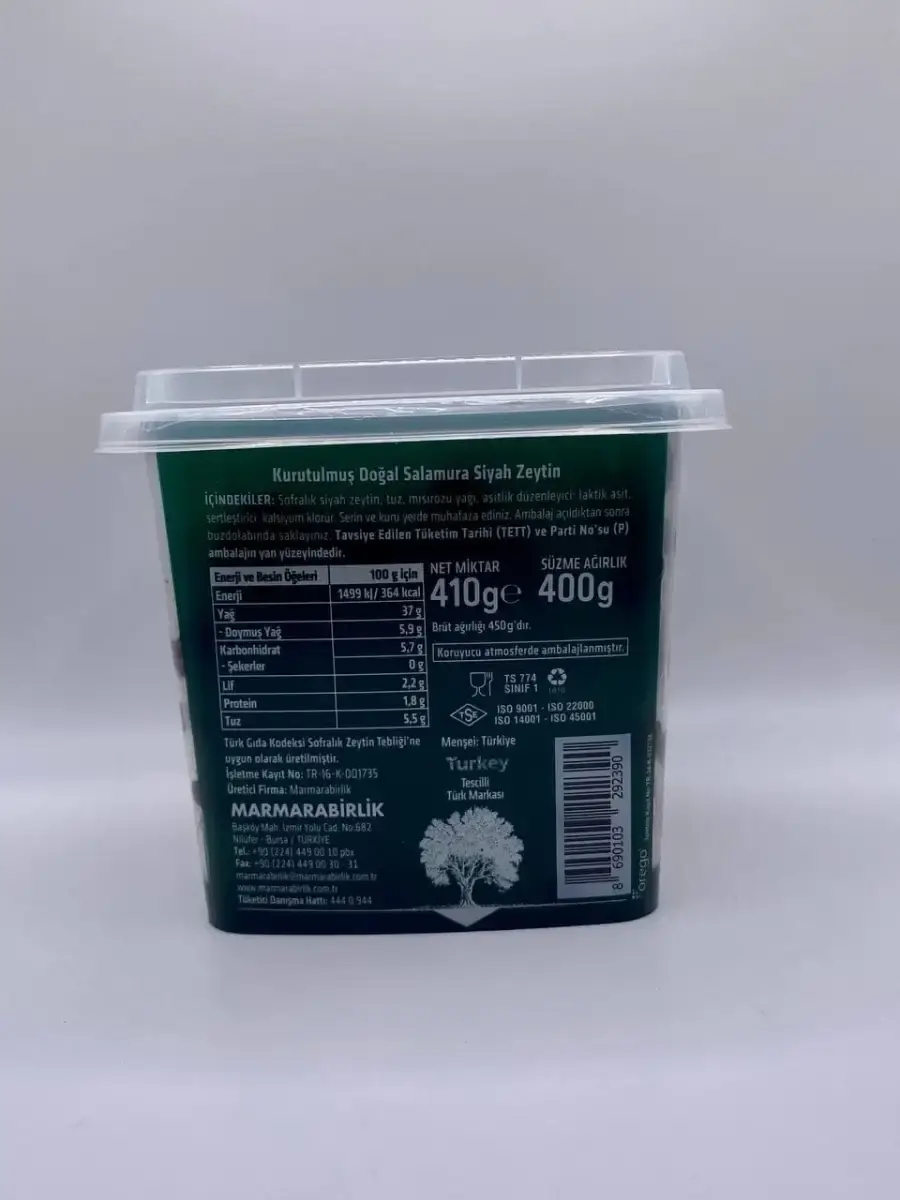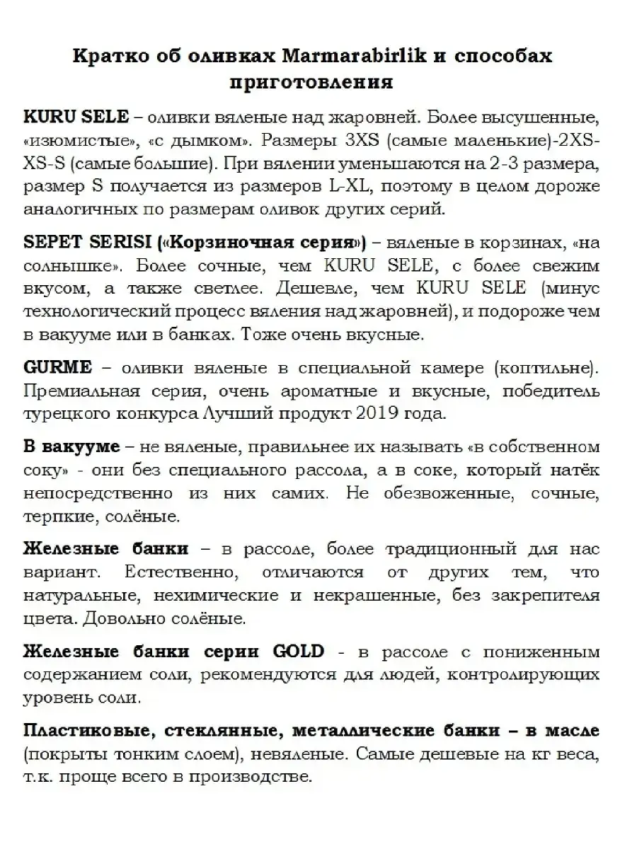 Оливки турецкой компании №1 Мармарабирлик отличаются от подавляющего большинства оливок. Прежде всего, эти оливки созрели на ветке и прошли естественную, а не химическую обработку. Она занимает от 6 до 9 месяцев, в отличие от 10-14 дней химических процессов. Оливки лежат в морской соли и постепенно избавляются от своей горечи. Однако горечь намеренно не убирается до конца: дело в том, что её придаёт олеуропеин - самое полезное вещество в оливках. Поэтому оливки Мармарабирлик не только имеют фирменные лёгкие горечь и солёность, но и полезны для здоровья. Они благотворно влияют на пищеварение, препятствуют старению тканей, возникновению гипертонии и рака, заболеваний сердца, сосудов. Люди, впервые попробовавшие Мармарабирлик, говорят - если это оливки, то что мы ели до этого? Попробуйте и Вы, чтобы убедиться, что вкус и польза совмещаются в одном продукте!