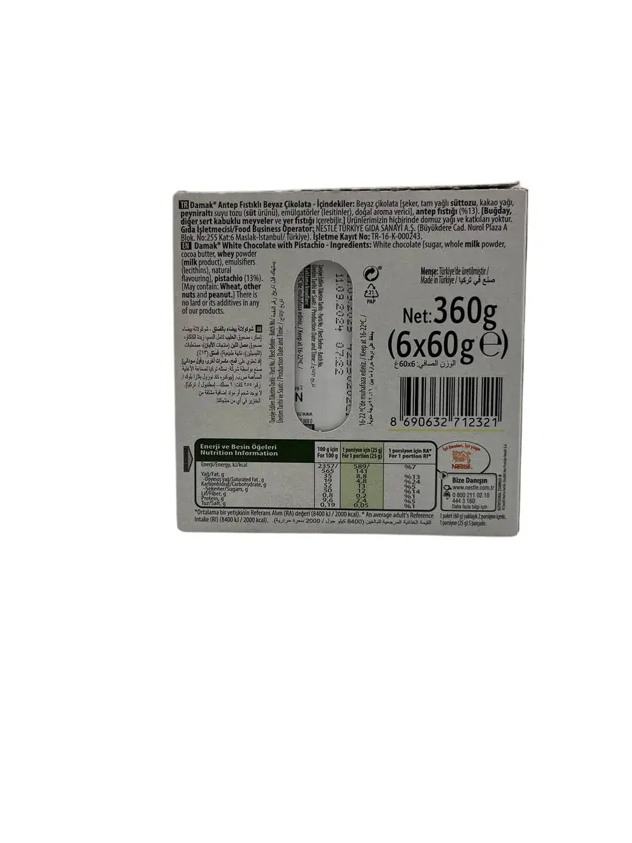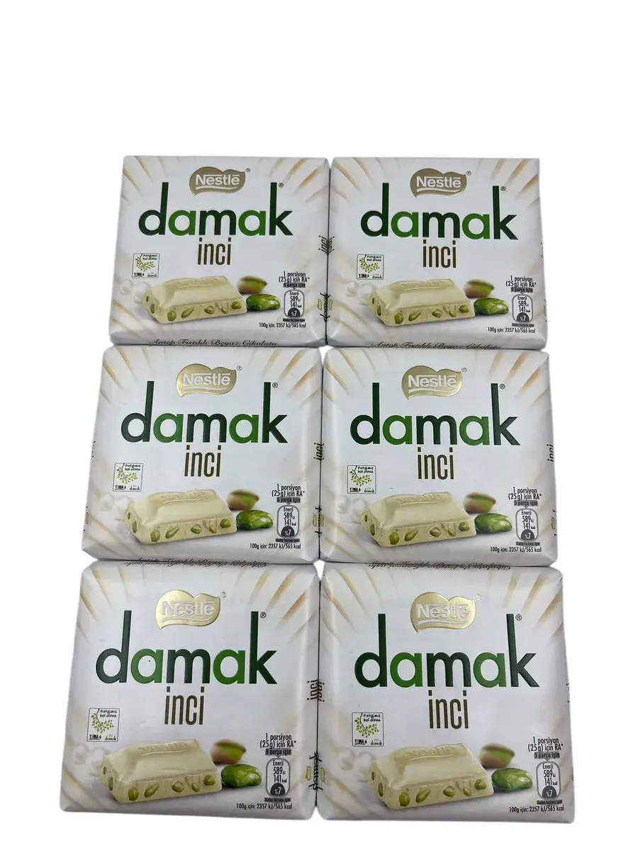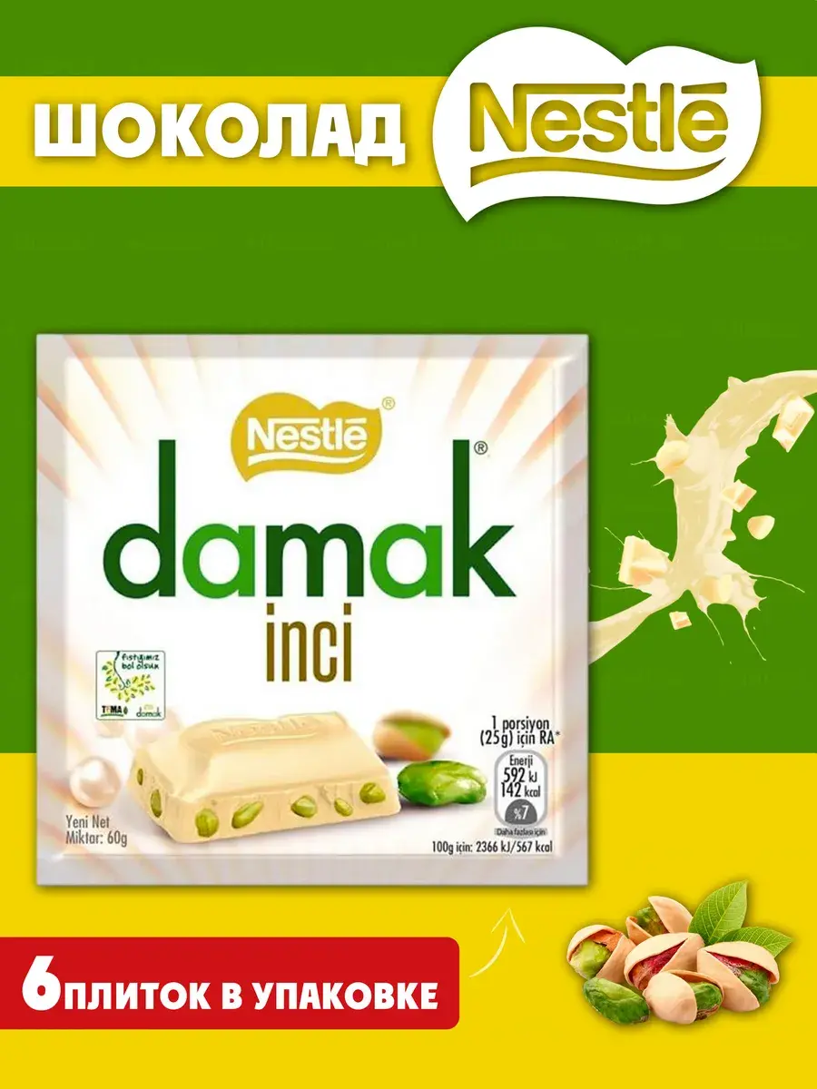 DAMAK INCI белый шоколад с фисташками от Nestle — это идеальное сочетание нежности и насыщенного вкуса! В каждой упаковке вас ждут 6 плиток по 60 грамм, каждая из которых подарит вам восхитительное наслаждение.