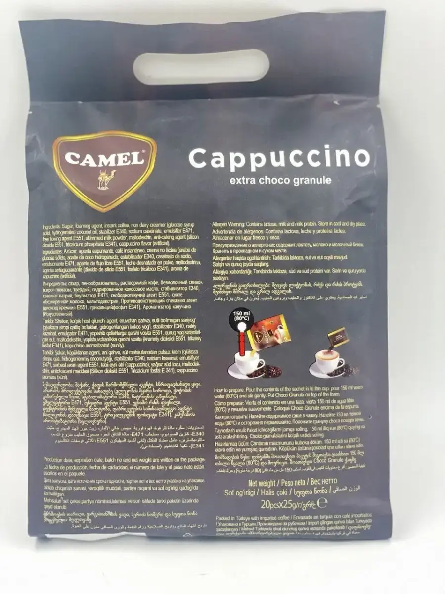 Представляем Вам нашу новинку - растворимый капучино с экстра шоколадными крошками от турецкого производителя чайных напитков Camel. Насыщенный аромат и богатый вкус капучино сочетаются с нежным шоколадным послевкусием, создавая неповторимый вкусовой букет. В каждой упаковке 20 порций по 25 грамм, что делает наш растворимый капучино идеальным напитком для дома, офиса или путешествий. У нас есть удобный формат упаковки, который позволяет быстро и легко приготовить свой любимый напиток. Наш растворимый капучино идеально подходит для тех, кто любит наслаждаться нежным ароматом кофе и шоколада в любое время дня. Попробуйте наш растворимый капучино с экстра шоколадными крошками и наслаждайтесь богатым вкусом каждый день!
