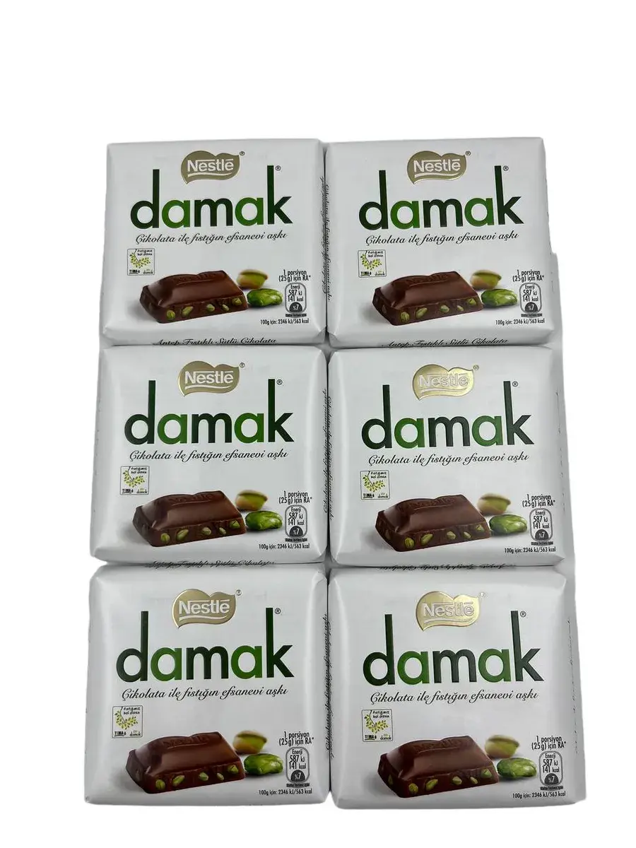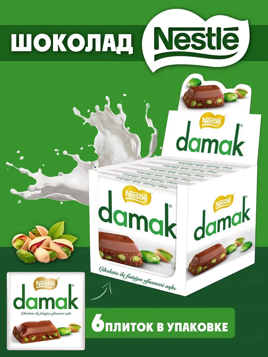 Nestle Damak Шоколад с фисташкой 6 шт (6х60 г) - Этот продукт сочетает в себе нежный вкус молочного шоколада и хрустящие кусочки фисташек, что делает его уникальным и запоминающимся. Упаковка содержит 6 плиток по 60 граммов, что позволяет легко наслаждаться любимым лакомством в любое время.