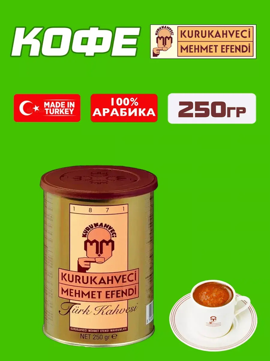 Турецкий молотый кофе Kurukahveci Mehmet Efendi (Курукахведжи Мехмет Эфенди)-это традиционный турецкий кофе, с которого начиналось развитие бренда. Это терпкий, купажированный кофе из нескольких сортов колумбийской арабики. Кофейные зёрна тщательно сортируются, обжариваются, запекаются и перемалываются в тончайший порошок практически в пыль. Идеально подходит для приготовления в турке.Из кофе Mehmet Efendi получается густой, сиропообразный напиток с горчинкой, нотками жжёного хлеба, карамели и пряностей.Способ приготовления: Налить холодную воду в турку, добавить кофе и сахар, перемешать. Поставить турку на малый огонь, довести до появления пенки, постоянно помешивая. Снять с огня на несколько секунд, чтобы пенка осела. Снова нагреть до появления пенки. Подождать несколько секунд, чтобы кофейная гуща осела на дно. Подавать в маленьких кофейных чашечках со стаканом холодной воды.