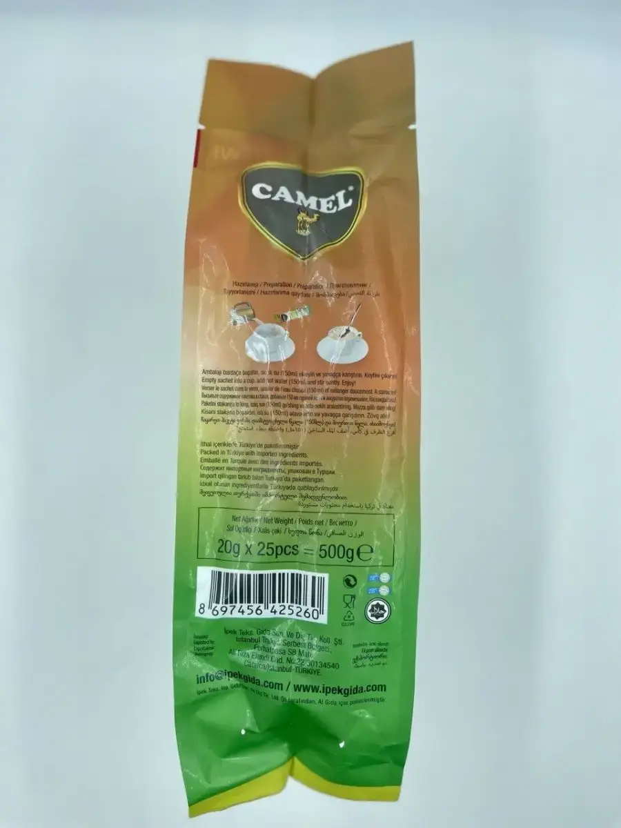 Представляем вам растворимый чай 3 в 1 от турецкого производителя Camel. Каждая упаковка содержит 20 порций по 25 грамм, что обеспечивает вам несколько недель запаса любимого напитка.