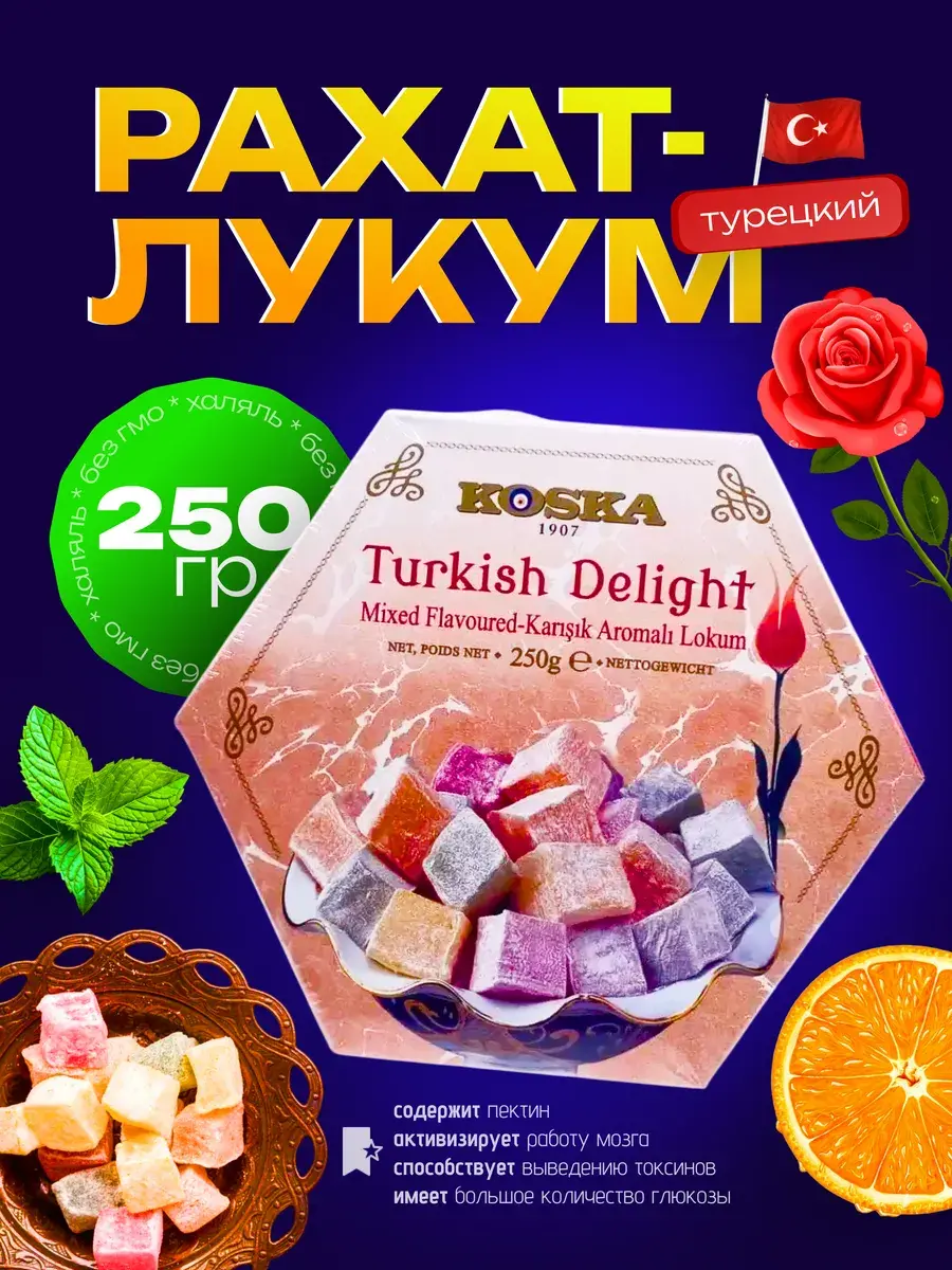 В данной карточке для Вашего удобства представлены несколько видов натурального турецкого лукума.Сочетание нежного, тающего во рту турецкого рахат-лукума с разнообразными фруктовыми соками или орешками (фундук или фисташки) понравится всем любителям восточных десертов и сладостей.Восточные сладости от крупнейшего и известнейшего производителя Турции марки Koska порадуют Вас своим натуральным составом, приверженностью традициям и ингредиентами высочайшего качества.В их составе нет искусственных добавок и консервантов.