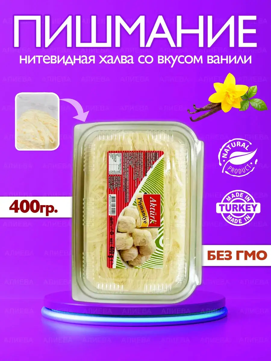 Хлопковая халва пашмак является визитной карточкой Турции. Этот десерт мгновенно тает во рту, за что особо любим детьми. Пишмание с фисташкой не разделена на порционные клубки, а представляет собой цельное облако пишмание с фисташками. Вы можете ознакомиться с полным ассортиментом товаров, а их у нас больше ста, кликнув на логотип нашего бренда.