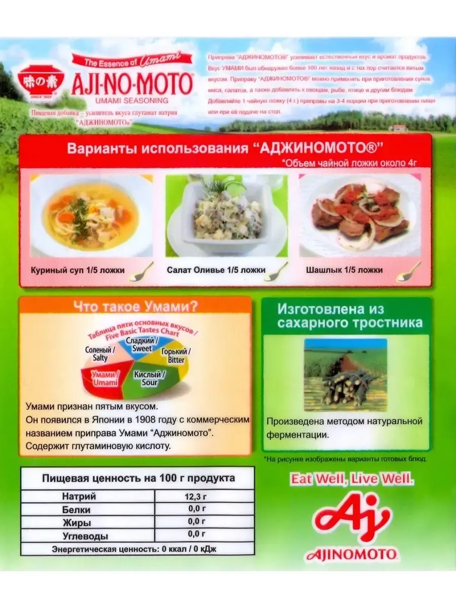 AJI-NO-MOTO - приправа УМАМИ высочайшего качества, известна также, как китайская приправа, хотя ее родина Япония. С приправой UMAMI ваши блюда обретут более глубокий и яркий вкус - буквально зазвучат по-новому. Вкусовая добавка AJI-NO-MOTO не имеет аромата, используйте её для всех ваших любимых блюд, независимо от того, к какой из национальных кухонь они относятся. Приправа производится из натуральных ингредиентов, преимущественно из сахарного тростника, переработанного посредством ферментации, точно так же, как, например, сыр или йогурт. Помогает уменьшить потребление соли и жиров. Добавьте УМАМИ в Ваши блюда для достижения более насыщенного вкуса его ингредиентов!