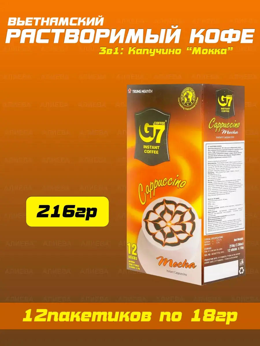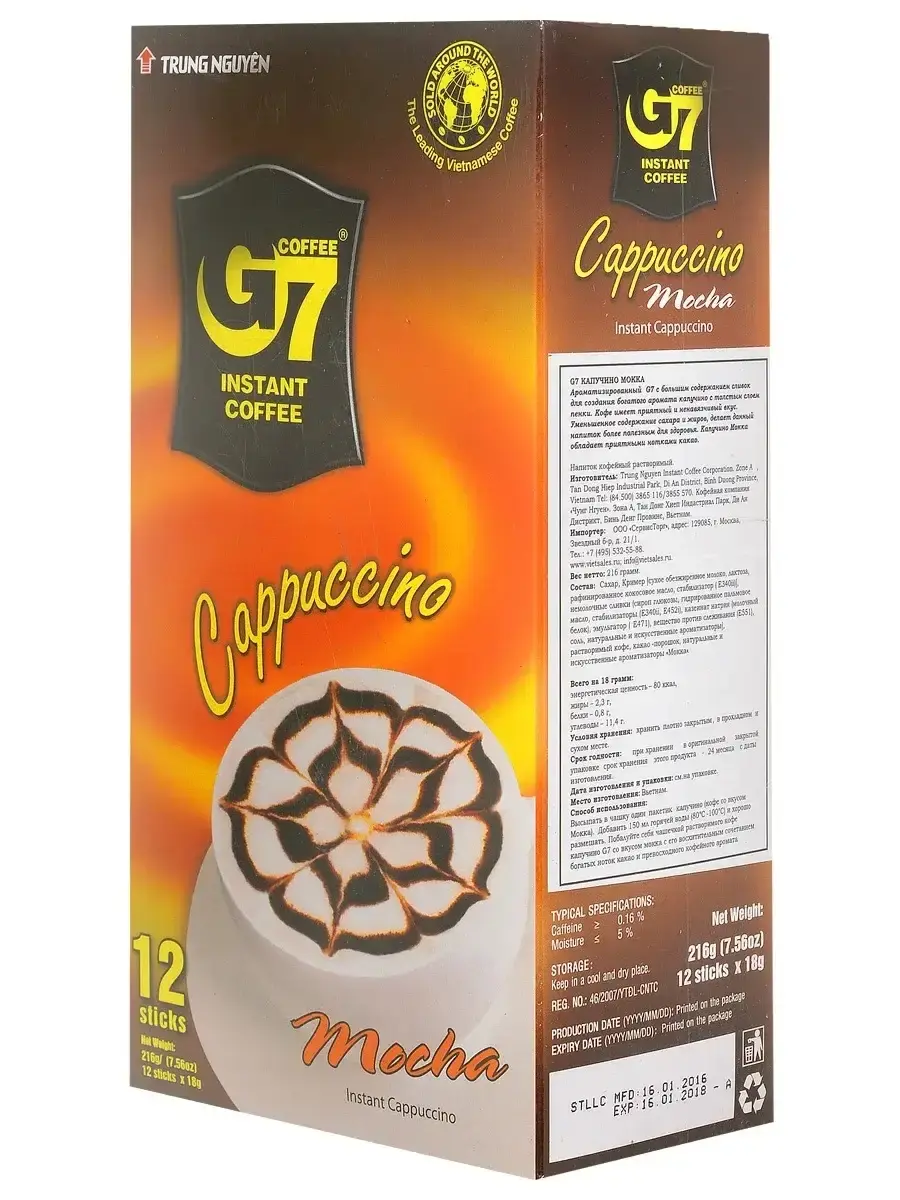 Для вашего удобства, в данной карточке вы можете приобрести : Trung Nguyen G7 Cappuccino Мокка , Cappuccino Hazelnut . Ароматизированный кофе Trung Nguyen G7 Cappuccino Мокка с большим содержанием сливок, идеально подходит для создания богатого аромата капучино с толстым слоем пенки. Этот растворимый кофе имеет приятный и ненавязчивый вкус. Уменьшенное содержание сахара и жиров, делает данный напиток более полезным для здоровья. Trung Nguyen G7 Cappuccino со вкусом Мокка обладает приятными нотками какао во вкусе.Cappuccino Hazelnut -быстрая альтернатива любимому многим капучино с нежной пенкой и мягким ароматом лесного ореха.Вьетнамский кофе давно прославился на весь мир благодаря своему необычному вкусу и пленяющему аромату. Многие, кто пробовали этот напиток, отмечают его необыкновенность и оригинальный, не похожий на другие, вкус. И это неудивительно, так как кофе у многих людей ассоциируется именно с Вьетнамом, откройте для себя насыщенный вкус настоящего кофе из Вьетнама!
