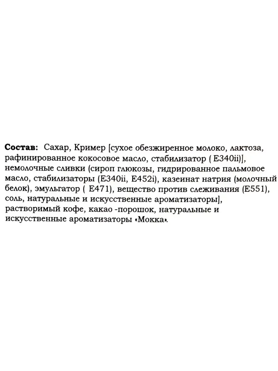 Растворимый кофе, сахар, сливки растительного происхождения, мальтодекстрин, соль