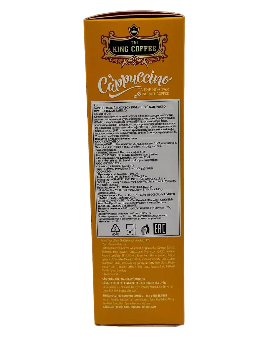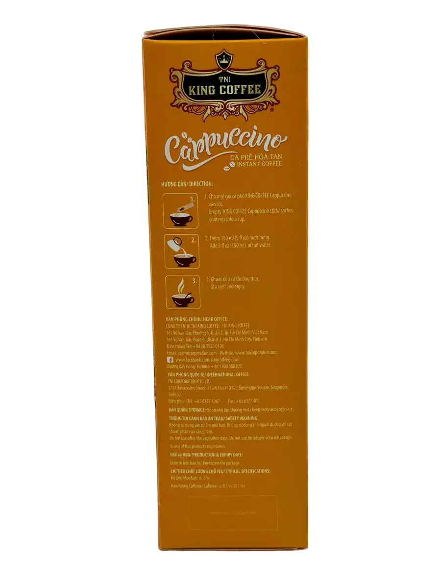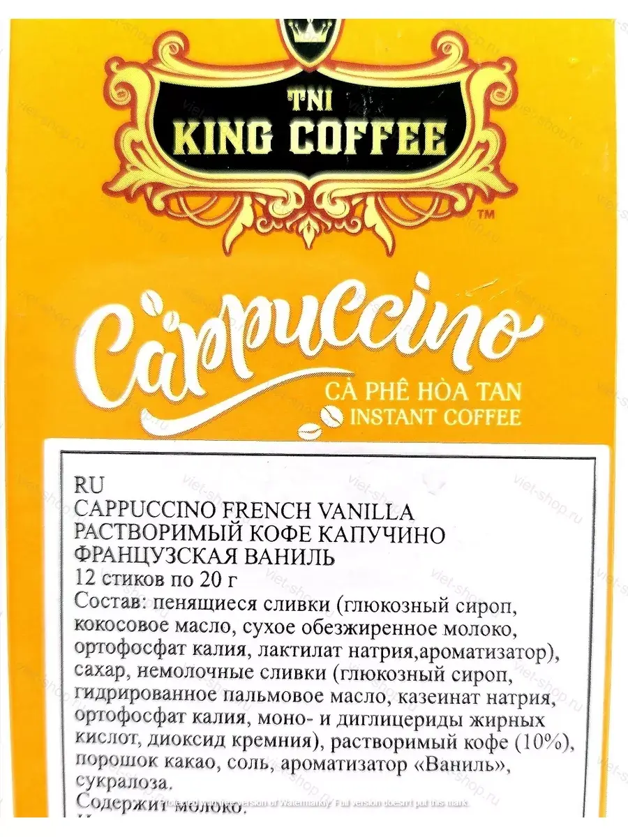 King Coffee приносит в мировую коллекцию Капучино множество вкусов, чтобы удовлетворить чувства преданных знатоков. В King Coffee Cappuccino со вкусом ванили используется кофейный экстракт из зерен Арабики высокого качества, смешанный со сливочным порошком, доведенный до чашки капучино, неотразимый со слоями сливочной пены невероятно гладкий смешанный с небольшим очаровательным вкусом тропических фруктов, рассеянным ощущением уюта и нежности. Для ваших моментов релаксации каждый день.