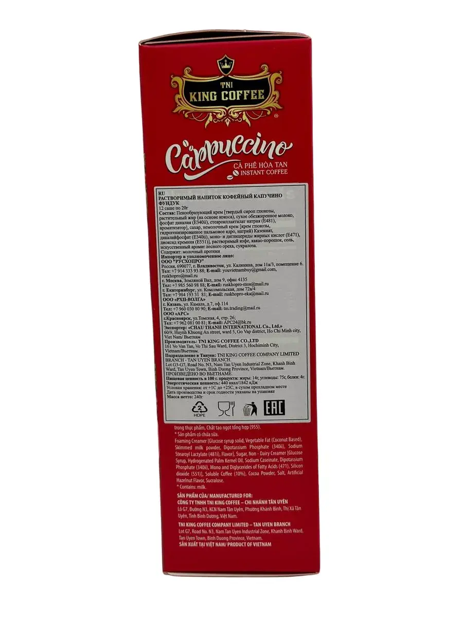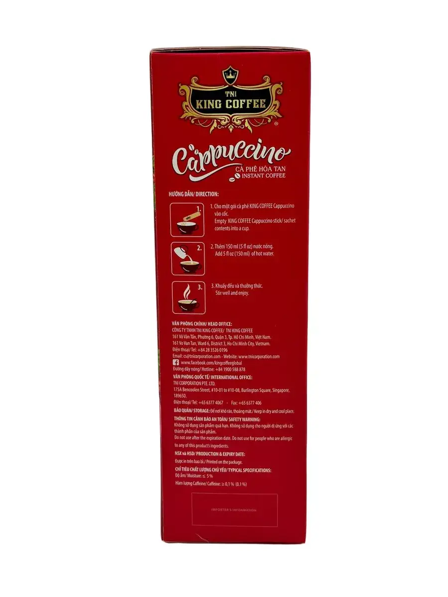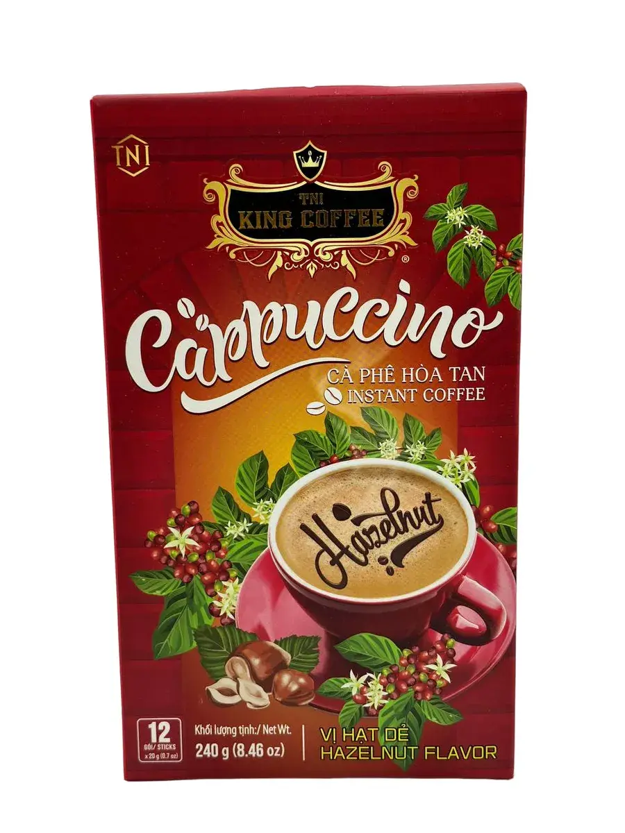 King Coffee приносит в мировую коллекцию Капучино множество вкусов, чтобы удовлетворить чувства преданных знатоков. В King Coffee Cappuccino со вкусом лесного ореха используется кофейный экстракт из зерен Арабики высокого качества, смешанный со сливочным порошком, доведенный до чашки капучино, неотразимый со слоями сливочной пены невероятно гладкий смешанный с небольшим очаровательным вкусом тропических фруктов, рассеянным ощущением уюта и нежности. Для ваших моментов релаксации каждый день.