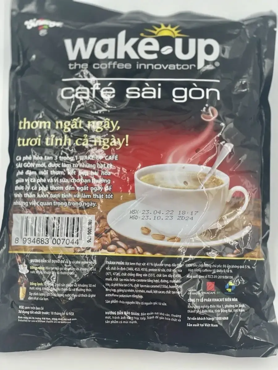 Растворимый кофе Wake Up 3 в 1 – это 100% натуральный состав, включающий растворимый вьетнамский кофе, сахарную пудру и сухие кокосовые сливки, соль и патоку. Всего после одной чашки кофе Вы полюбите этот яркий, насыщенный вкус растворимого кофе в сочетании с нежной сладкой пенкой и смелым ароматом. После заваривания кофе имеет ярко выраженную крепость и надолго оставляет приятное послевкусие. Вина кафе Wake Up 3 в 1 – быстрое решение для маленького перерыва на отличный кофе-брейк.