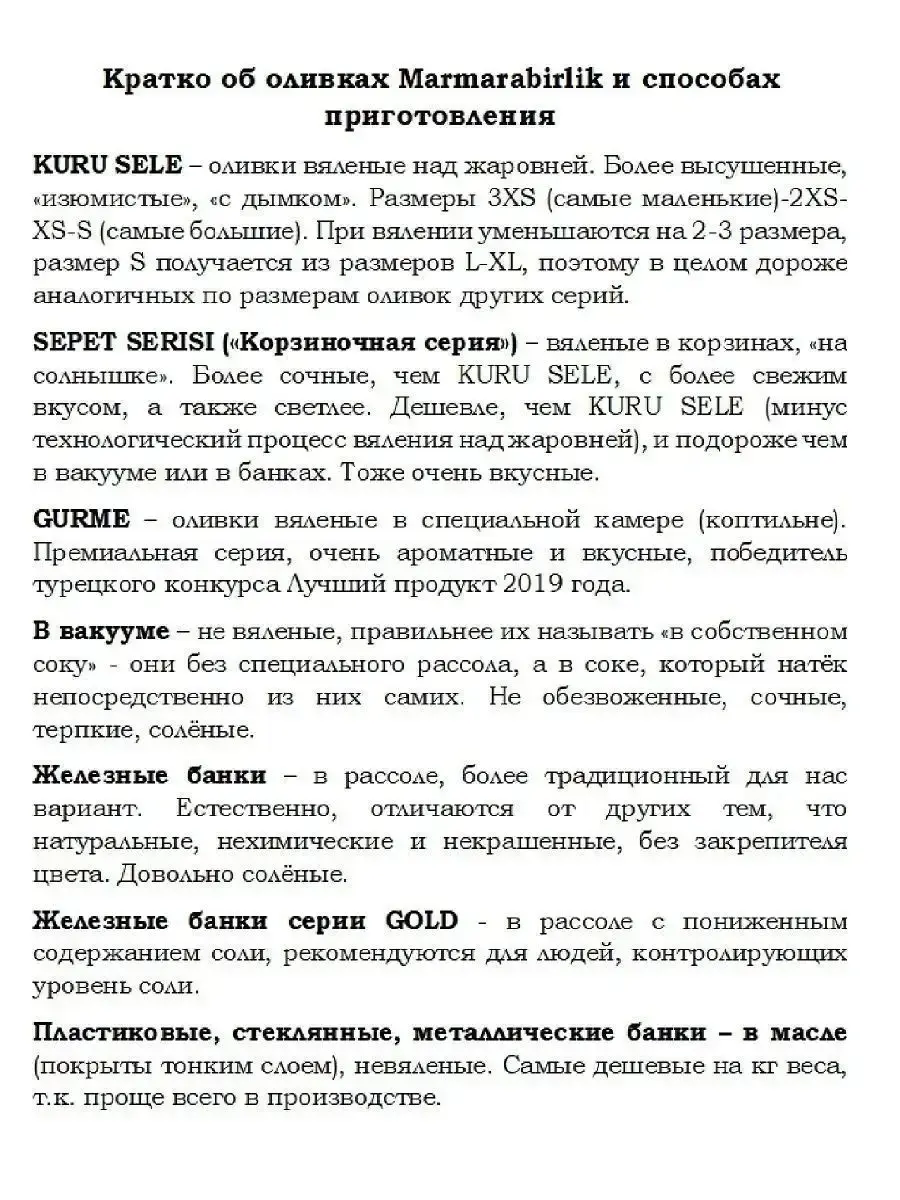 Маслины, оливки - некогда заморские деликатесы уже давно и прочно вошли в нашу жизнь, их сейчас можно купить практически во всех наших магазинах, но мы хотим представить вам маринованные оливки и маслины произведённые государственным предприятием Marmarabirlik в Турции. Эти оливки не похожи на те, что продают в банках. жидкости в них практически нет, только небольшое количество, ароматного, вкуснейшего масла темного винного цвета. И самое главное это созревшие естественным путем маслины, коричневого цвета, а не крашеные, в отличие от знакомой всем нам консервированной продукции. В этом можно убедиться по некоторой неоднородности цвета кожицы и по косточке, которая не крашеная, а натурального цвета.Косточка от мякоти отделяется легко. Если надо добавить маслины в салат, то никаких проблем не возникнет. Мякоть остается вся целой. Маслины имеют очень яркий вкус, они в меру соленые, с легкой кислинкой, островатые, с приятной горчинкой. И с пикантным послевкусием.