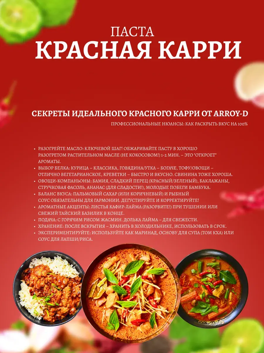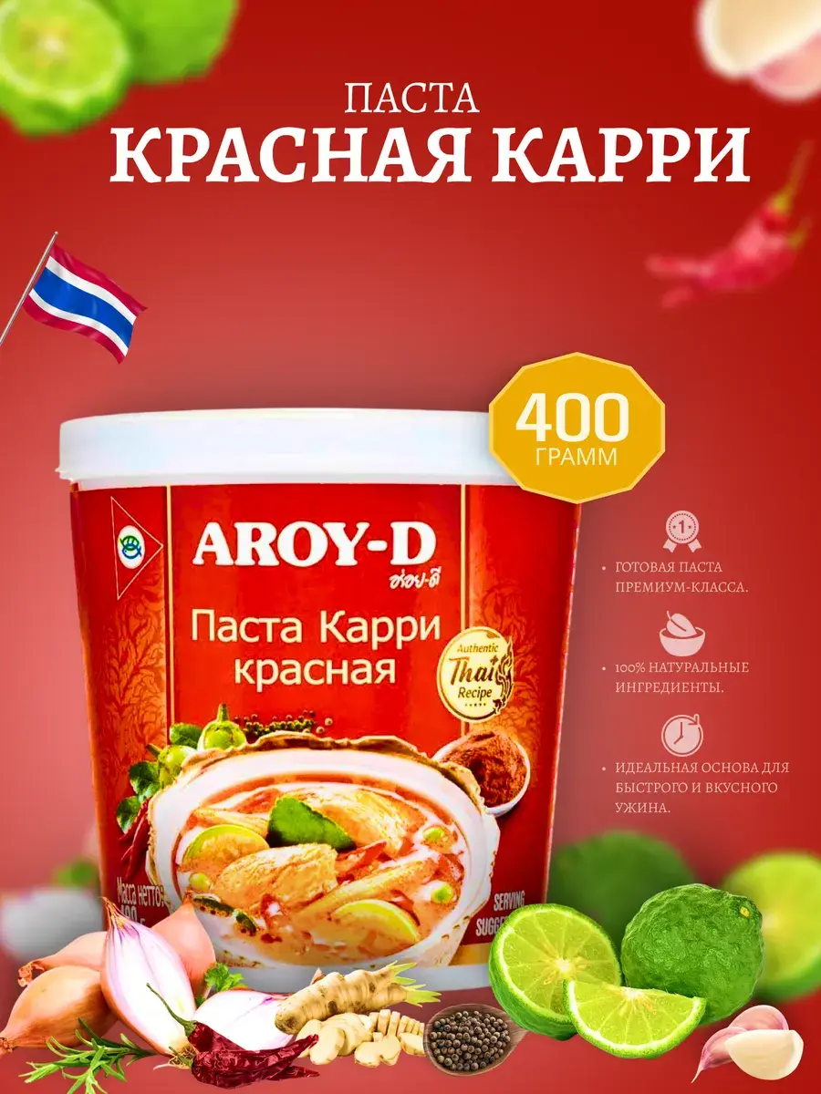 Эта паста карри станет универсальным помощником на вашей кухне, открывая безграничные возможности для кулинарных экспериментов. Она идеально подходит для приготовления мяса на гриле, где ее насыщенный вкус и аромат раскрываются особенно ярко, образуя аппетитную пряную корочку на стейках или котлетах. Не менее хороша она и в качестве основы для соусов к лапше, придавая им пикантность и легкую остроту, или как маринад для запеченной птицы, пропитывая ее соки неповторимым букетом тайских специй. Красная паста карри прекрасно дополнит тушеное мясо с овощами, объединяя все ингредиенты в единое гармоничное блюдо с богатым и сложным вкусом. Для тех, кто предпочитает менее острые варианты, пасту можно смягчить, добавив в блюдо кокосовое молоко — оно придаст нежный сливочный оттенок и сбалансирует жгучесть, или соевый соус, который подчеркнет вкус и сделает его более округлым. Натуральный состав без искусственных добавок делает эту пасту не только вкусной, но и полезной — традиционные специи в ее составе благотворно влияют на пищеварение и обмен веществ. Красная паста карри от Aroy-D — это ваш пропуск в мир ярких гастрономических впечатлений, который позволяет легко и быстро создавать аутентичные тайские блюда с их неповторимым темпераментом и страстью, не выходя из дома.