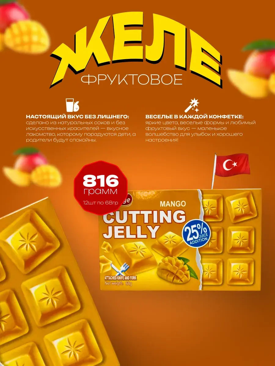 Желе со вкусом манго от турецкого производителя Prestige – это нежный и сочный десерт в форме шоколадной плитки. Каждая упаковка содержит 12 порций по 68 грамм, а для удобства использования внутри есть нож и вилка. Насладитесь ярким тропическим вкусом спелого манго в удобном и оригинальном формате. Желе Prestige – идеальный выбор для любителей необычных сладостей и ценителей качественных десертов.