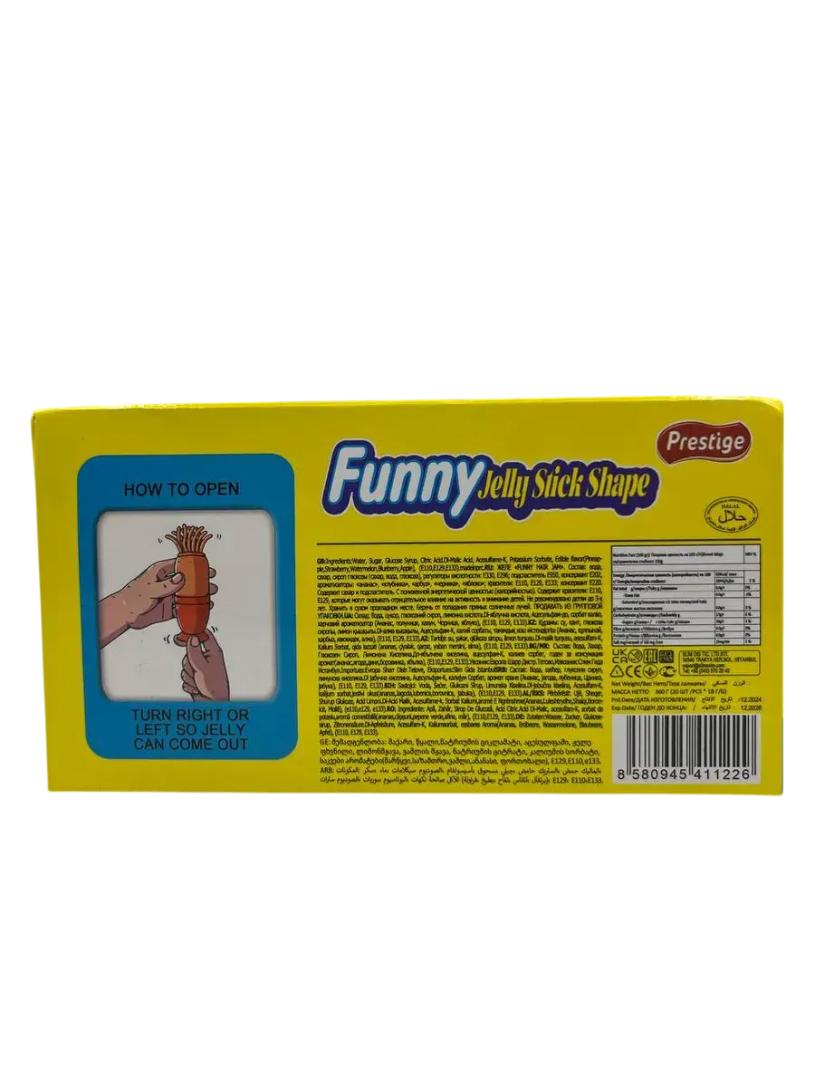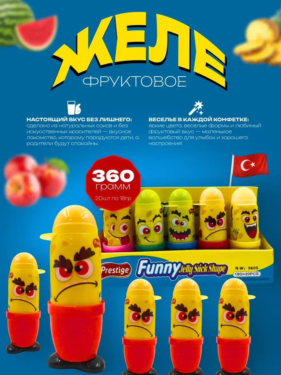 Откройте для себя волшебный мир турецкого желе Prestige — целый отряд ярких человечков, застывших в разных эмоциях! Каждая упаковка приносит вам двадцать весёлых персонажей, каждый из которых содержит по 18 граммов нежного фруктового желе. Пять солнечных вкусов — ананас, клубника, арбуз, черника и яблоко — превращают каждый кусочек в маленькое вкусовое приключение. Благодаря индивидуальной упаковке каждого человечка, свежесть, гигиеничность и сочность желе сохраняются идеально, а взять с собой порцию радости в дорогу, на прогулку или в школу становится проще простого. Порадуйте себя и близких этим уникальным сочетанием забавной формы, сочного вкуса и неизменно высокого турецкого качества от Prestige. Положительные эмоции гарантированы!