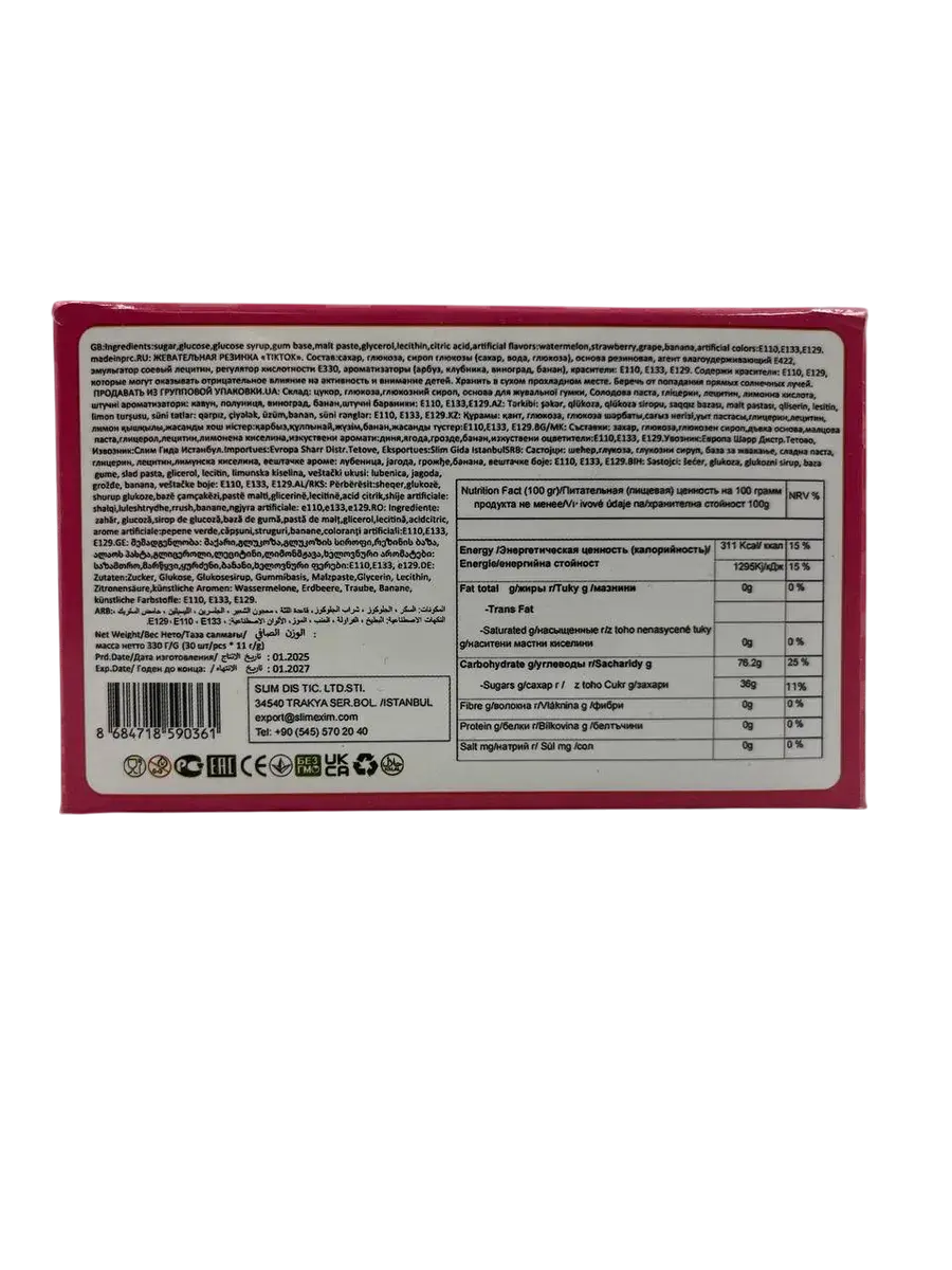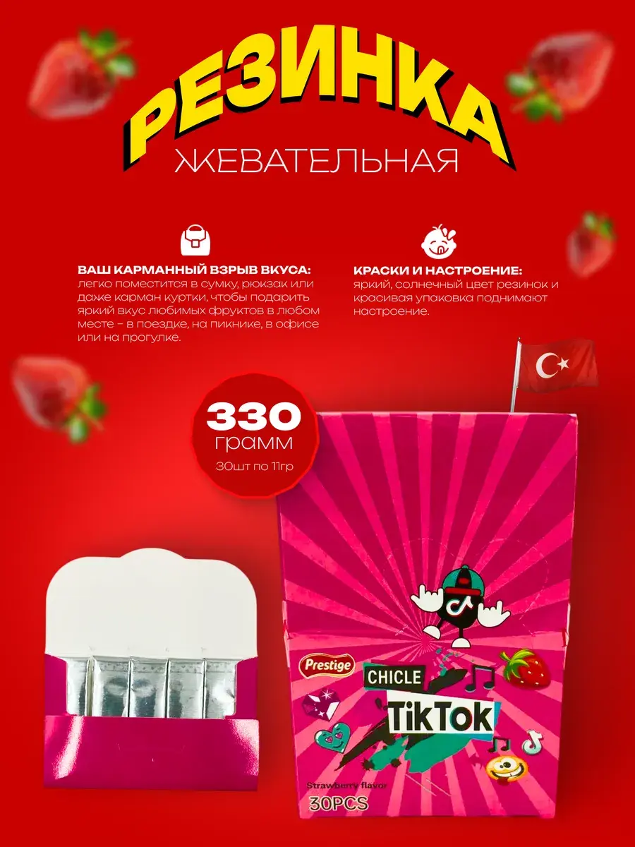 Турецкий производитель Prestige представляет жевательную резинку Tik Tok Chile с насыщенным вкусом спелой клубники. В каждой упаковке содержится 30 индивидуальных упаковок, в каждой из которых находится по 5 стиков жевательной резинки.