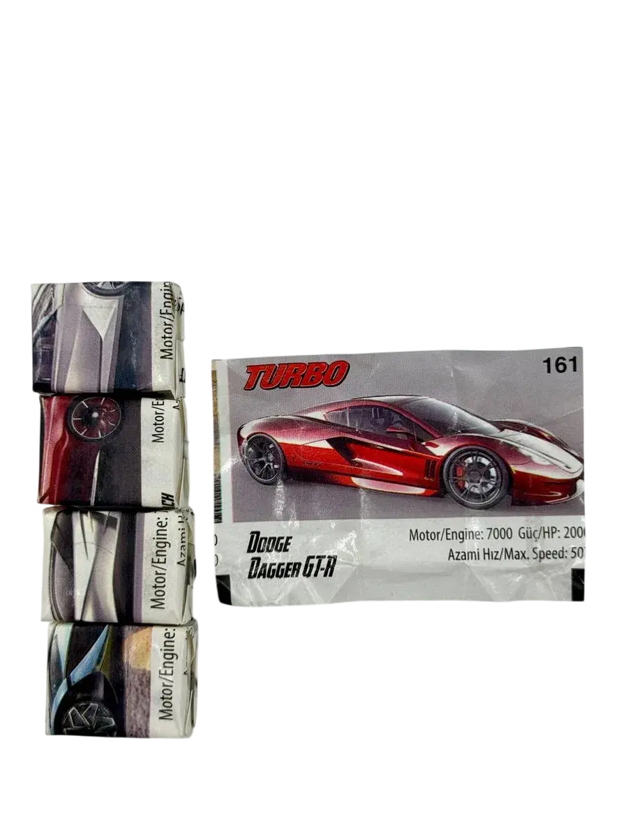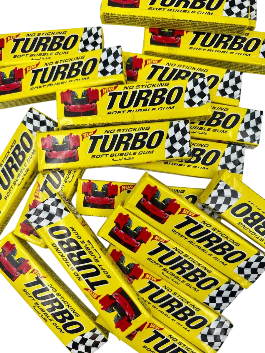 Легендарная жевательная резинка до сих пор пользуется большой популярностью у мужчин всех возрастов. В более ранних версиях Turbo выпускалась с квадратным вкладышем, затем они сменились фотореалистичными изображениями автомобилей последних поколений. Однако жевательная резинка производится с соблюдением того же технологического процесса, у неё всё тот же персиковый вкус и запах, пробуждающие воспоминания. Раньше Turbo была доступна поштучно, теперь ее можно купить блоком, что предотвращает преждевременное затвердевание. Внимание: чтобы жвачка дольше оставалась мягкой, храните ее в закрытом блоке. Заветные фантики коллекционировали и очень часто играли в школах "Во вкладыши". В новые вкладыши тоже можно играть, это установлено экспериментально.