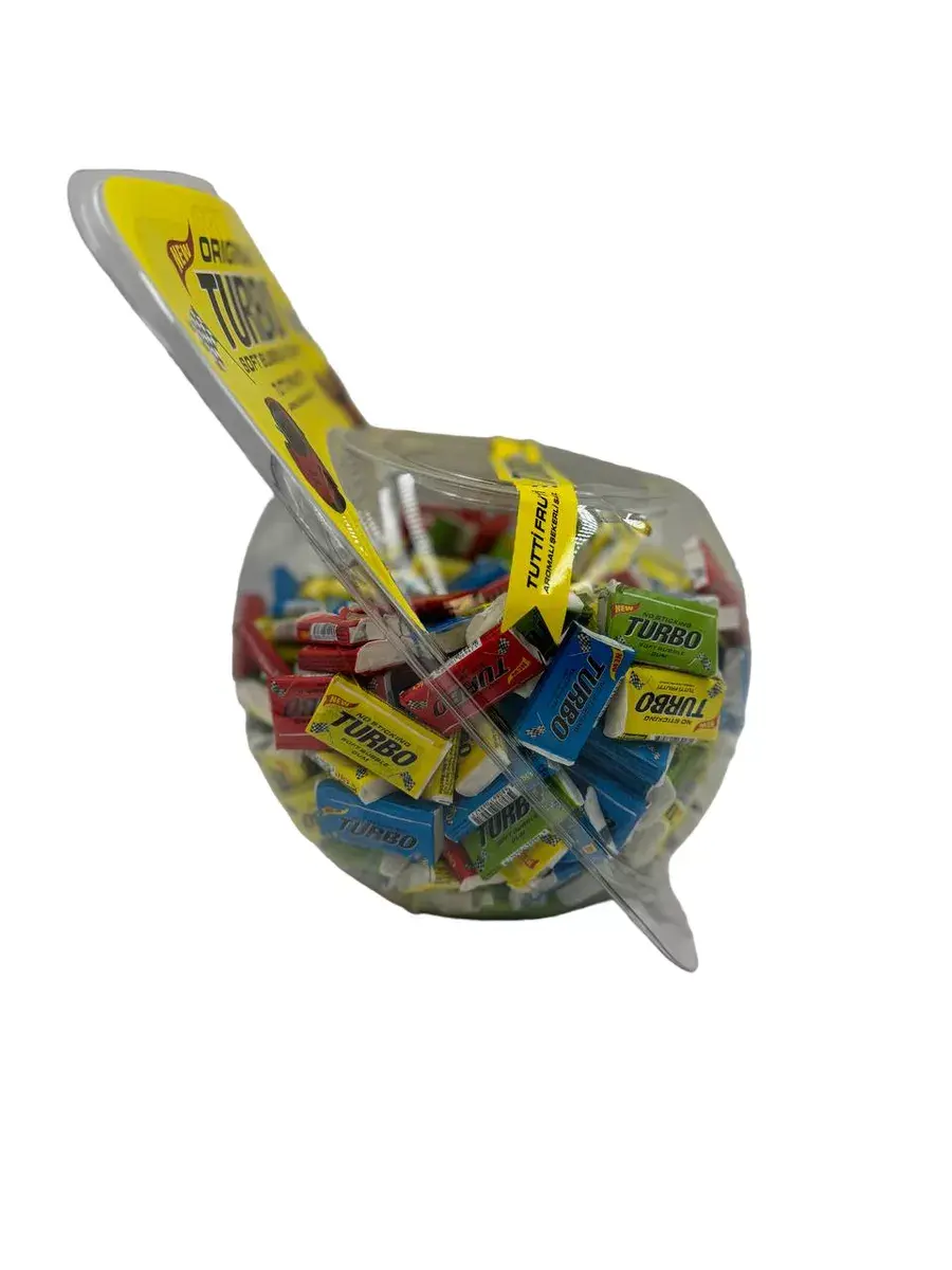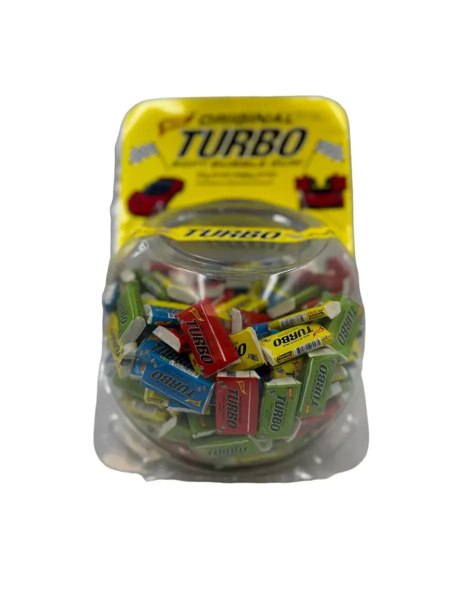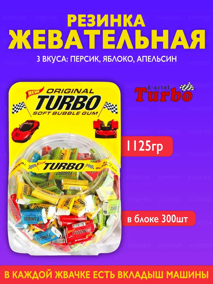 Жевательные резинки Turbo из детства. Приятный долгий сладко-кисленький фруктовый вкус. 5 ароматов: персик, яблоко, дыня, арбуз, клубника. Освежают благодаря содержанию ментола. Надуваются большими пузырями. Интересная форма жевательной резинки напоминает оставленную на дороге колею от колес автомобиля. В упаковке 100 жвачек в индивидуальных упаковках. В каждой красивая фирменная наклейка, с всевозможными автомобилями от отечественных до иномарок. На наклейках изображена цветная фотография автомобиля, его марка и модель, а также основные технические характеристики авто: HP (мощность двигателя в лошадиных силах), максимальная скорость, высота подъема и угол преодолеваемого уклона. Коллекционерами ценится эта серия, вкладыши регулярно пополняются новыми моделями, жевательная резинка выпускается с 1980-х годов. Взрослым и детям, желающим надуть большой пузырь из жвачки, сластенам, коллекционерам или автолюбителям. Каждый найдет свое достоинство жевательной резинки Turbo! Попробуйте)