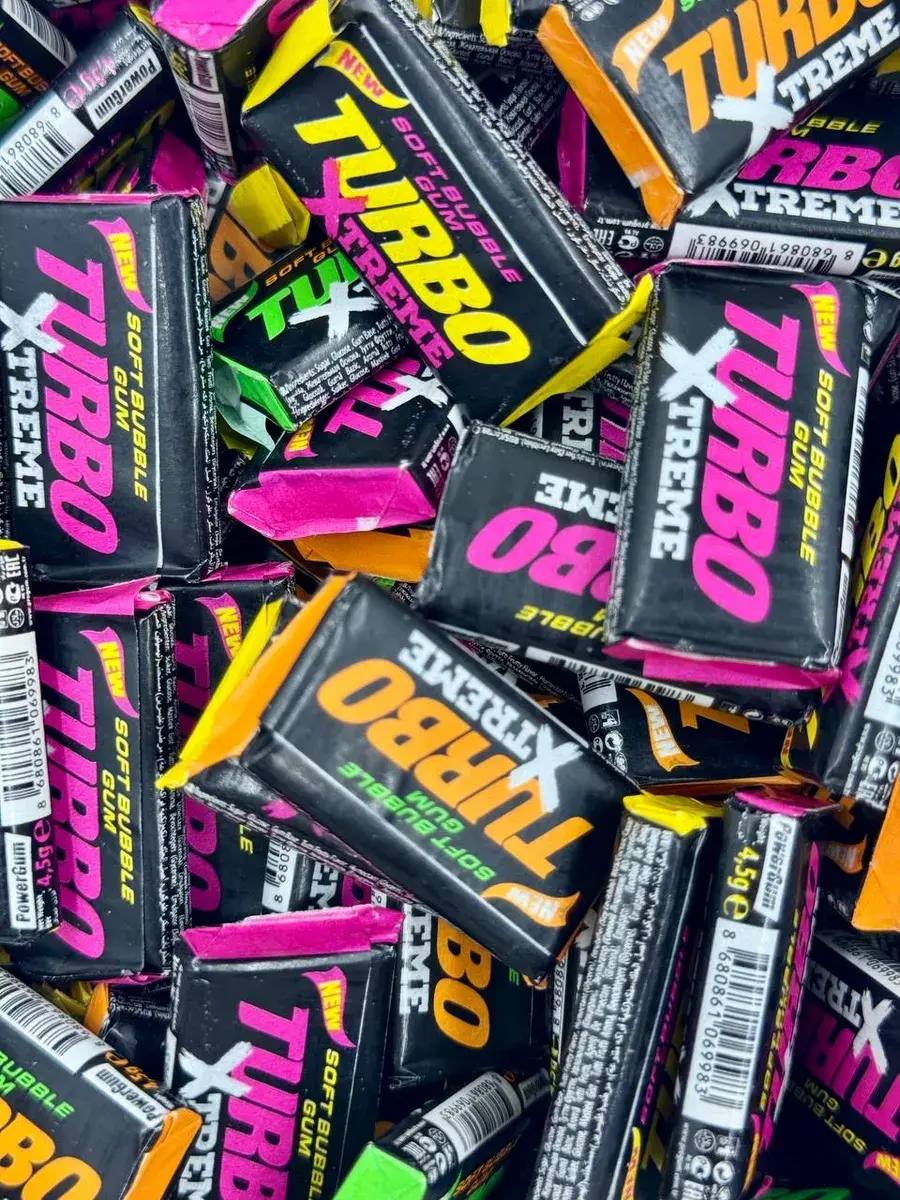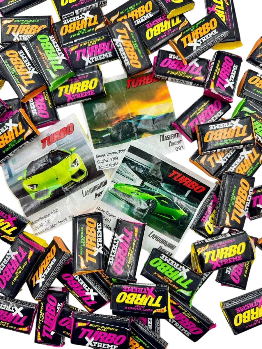 Легендарная жевательная резинка до сих пор пользуется большой популярностью у мужчин всех возрастов. В более ранних версиях Turbo выпускалась с квадратным вкладышем, затем они сменились фотореалистичными изображениями автомобилей последних поколений. Однако жевательная резинка производится с соблюдением того же технологического процесса, у неё всё тот же персиковый вкус и запах, пробуждающие воспоминания. Раньше Turbo была доступна поштучно, теперь ее можно купить блоком, что предотвращает преждевременное затвердевание. Внимание: чтобы жвачка дольше оставалась мягкой, храните ее в закрытом блоке. Заветные фантики коллекционировали и очень часто играли в школах "Во вкладыши". В новые вкладыши тоже можно играть, это установлено экспериментально.