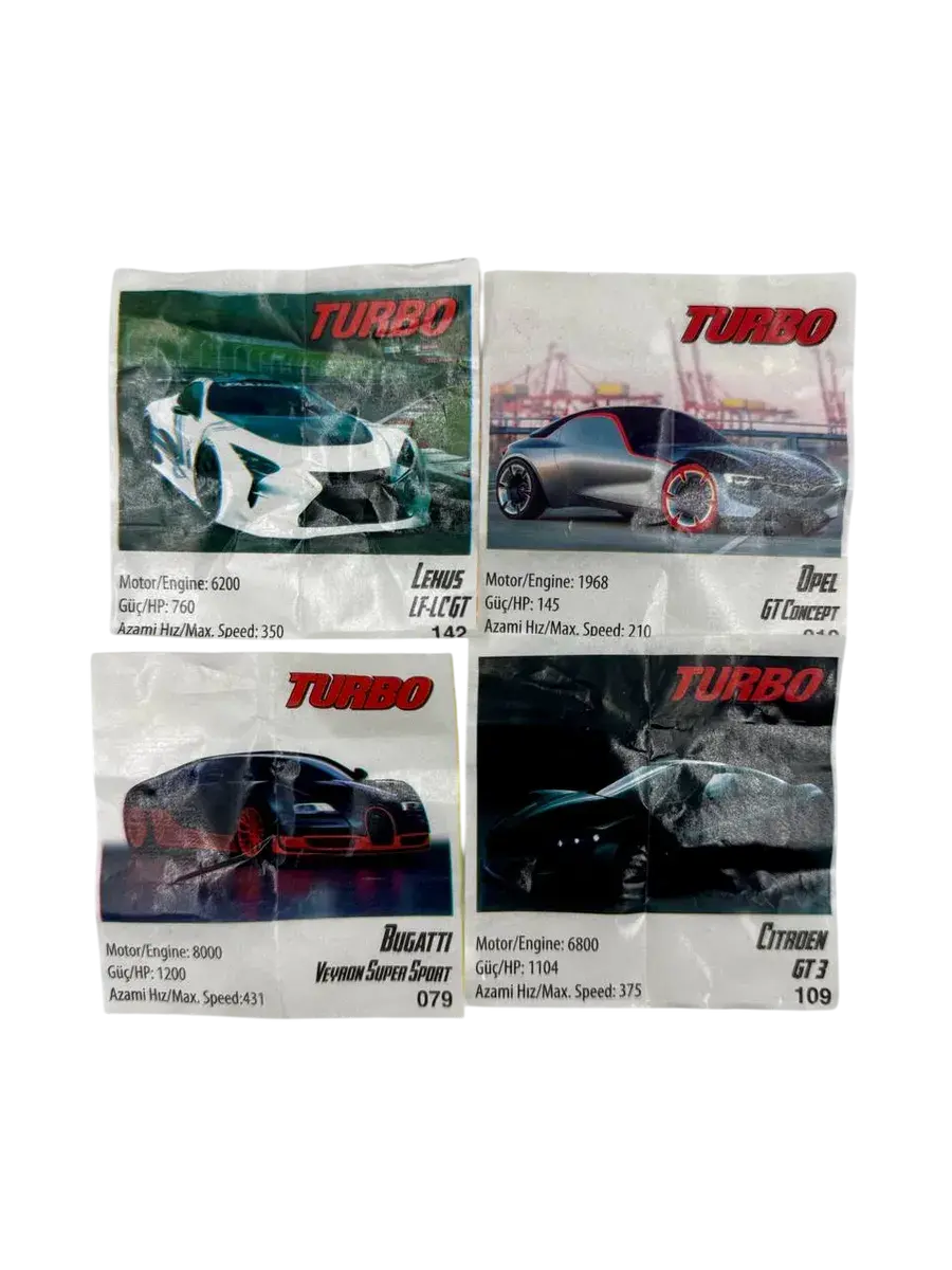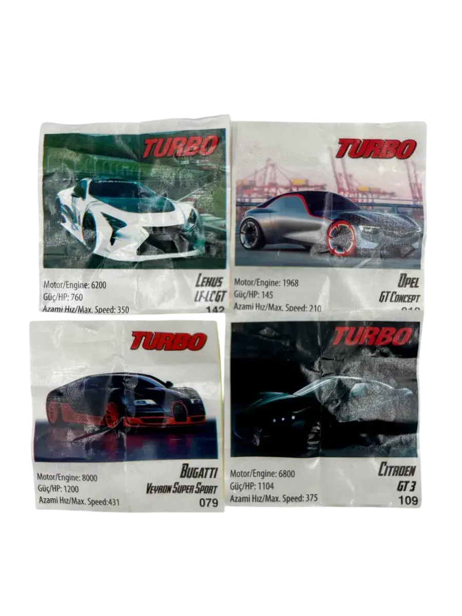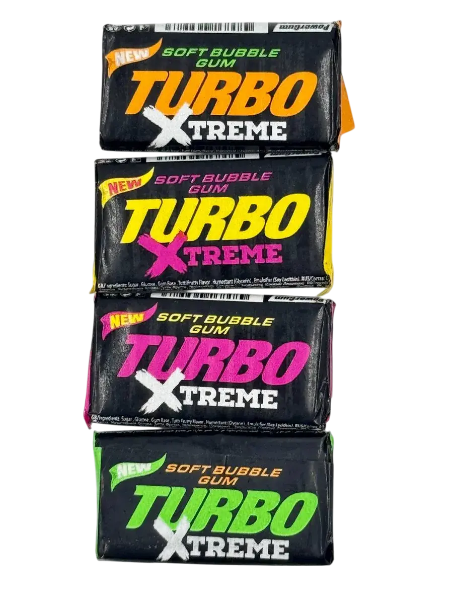 Легендарная жевательная резинка до сих пор пользуется большой популярностью у мужчин всех возрастов. В более ранних версиях Turbo выпускалась с квадратным вкладышем, затем они сменились фотореалистичными изображениями автомобилей последних поколений. Однако жевательная резинка производится с соблюдением того же технологического процесса, у неё всё тот же персиковый вкус и запах, пробуждающие воспоминания. Раньше Turbo была доступна поштучно, теперь ее можно купить блоком, что предотвращает преждевременное затвердевание. Внимание: чтобы жвачка дольше оставалась мягкой, храните ее в закрытом блоке. Заветные фантики коллекционировали и очень часто играли в школах "Во вкладыши". В новые вкладыши тоже можно играть, это установлено экспериментально.