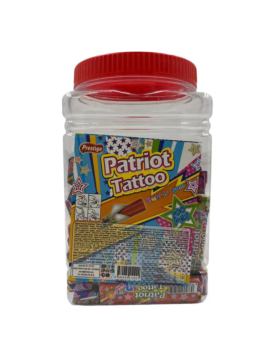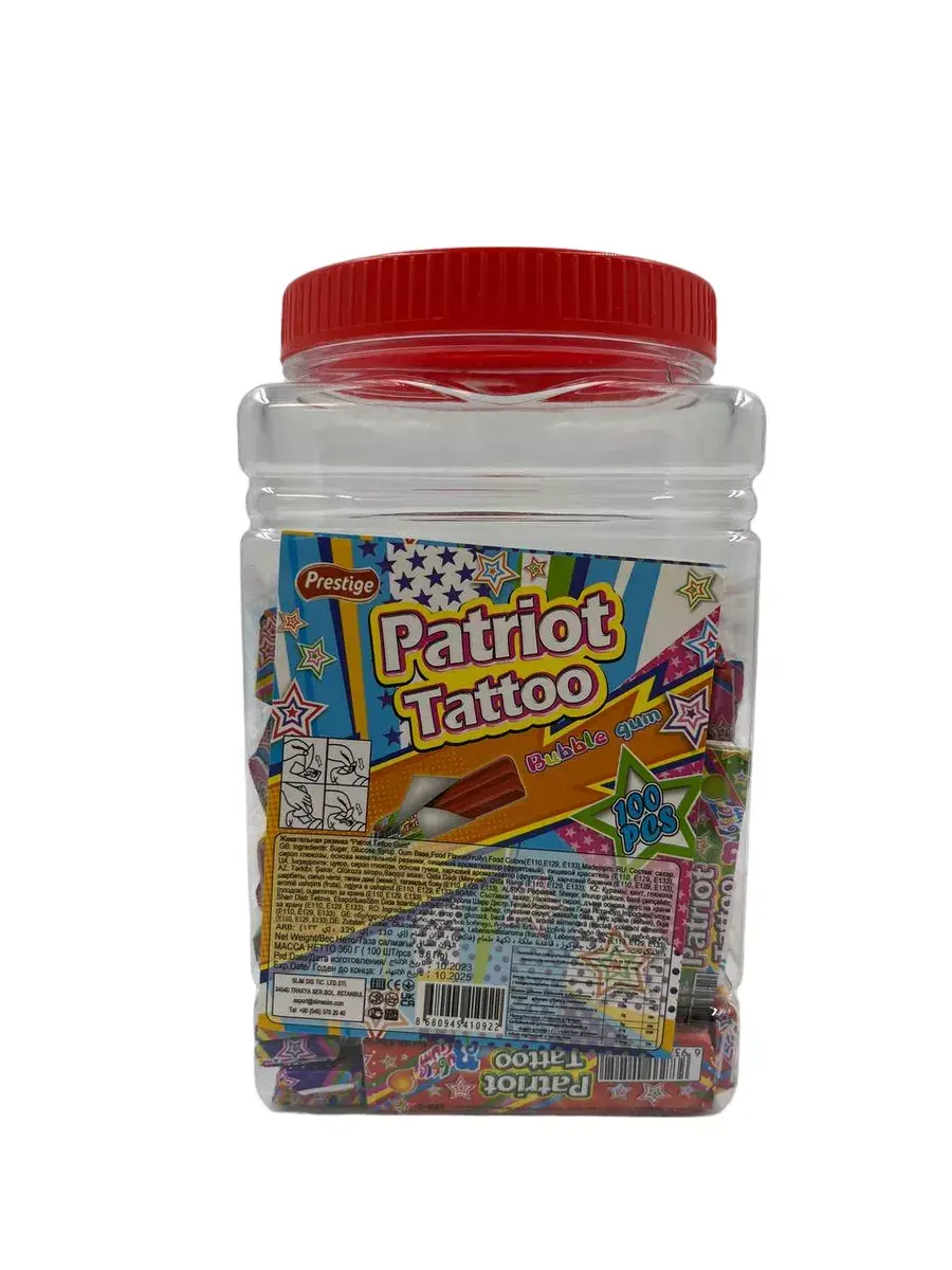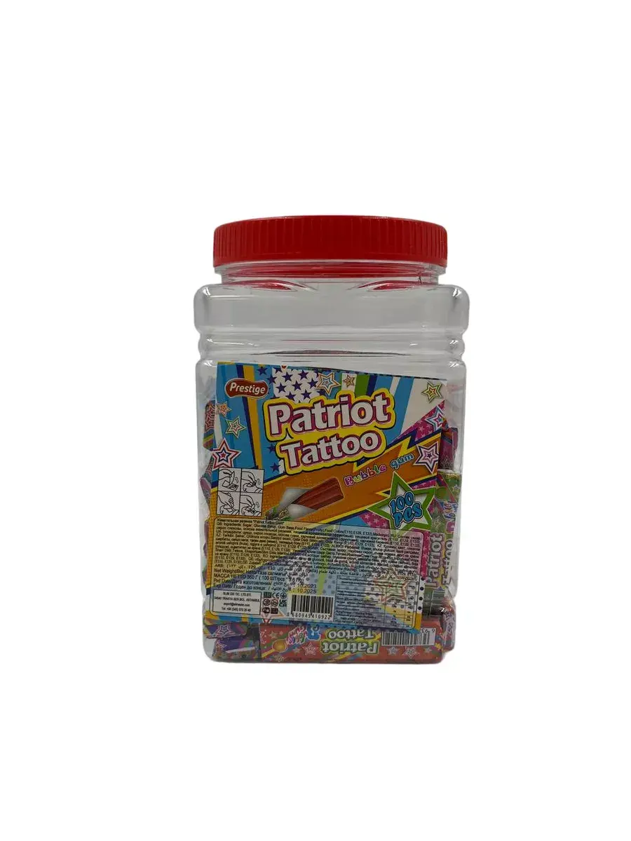 Жевательная резинка Patriot Tatoo со вкусом Бабл-Гам обязательно понравится вашим детям. Это не только вкусная жевательная резинка, но также стильные и яркие татуировки, которые не оставят равнодушным вашего ребёнка! Приятный подарок для детского праздника, в упаковке 100 штук.Жевательная резинка Patriot Tatoo - Жвачка, которой хватит надолго!