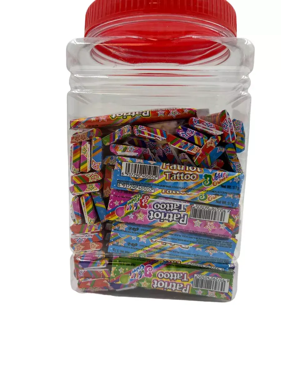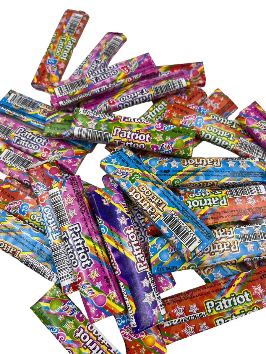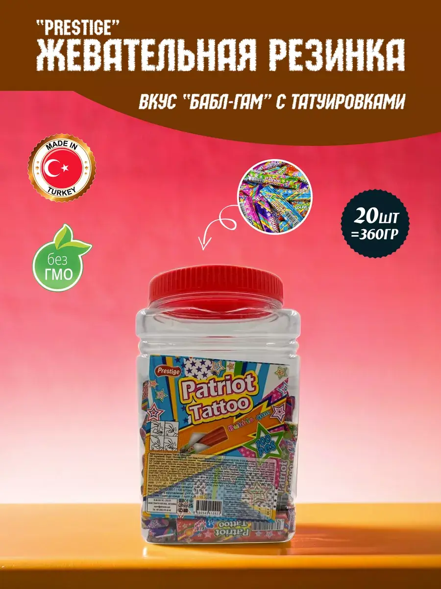 Жевательная резинка Patriot Tatoo со вкусом Бабл-Гам обязательно понравится вашим детям. Это не только вкусная жевательная резинка, но также стильные и яркие татуировки, которые не оставят равнодушным вашего ребёнка! Приятный подарок для детского праздника, в упаковке 100 штук.Жевательная резинка Patriot Tatoo - Жвачка, которой хватит надолго!