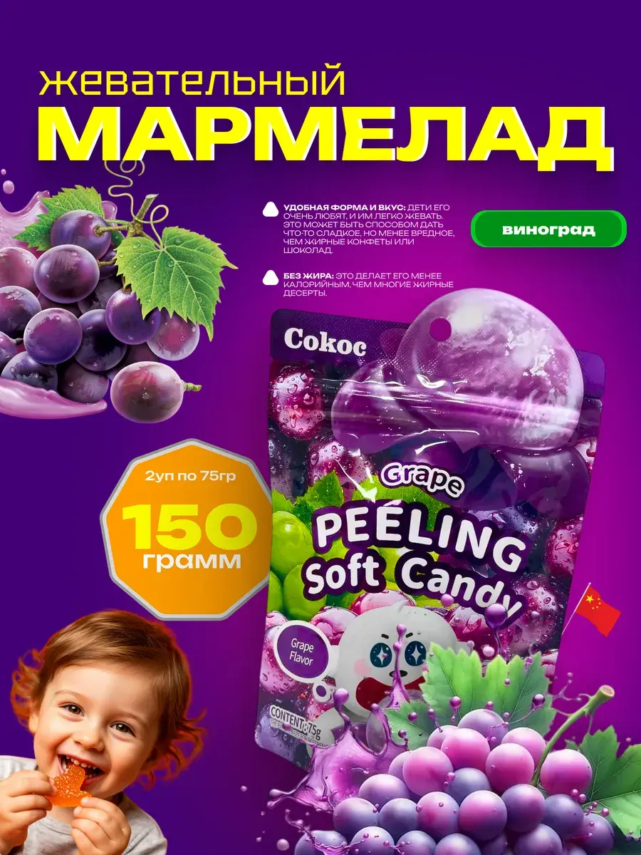 Попробуйте нежный мармелад в форме спелой виноградины с эффектом 3D! Каждая сладость – это сочный взрыв натурального вкуса винограда, который тает во рту. Удобная индивидуальная упаковка сохраняет свежесть и аромат, а в комплекте вы получаете сразу две упаковки с этими освежающими лакомствами. Идеально для тех, кто любит сочные фруктовые вкусы и хочет порадовать себя или сделать оригинальный сладкий подарок. Наслаждайтесь каждым кусочком.