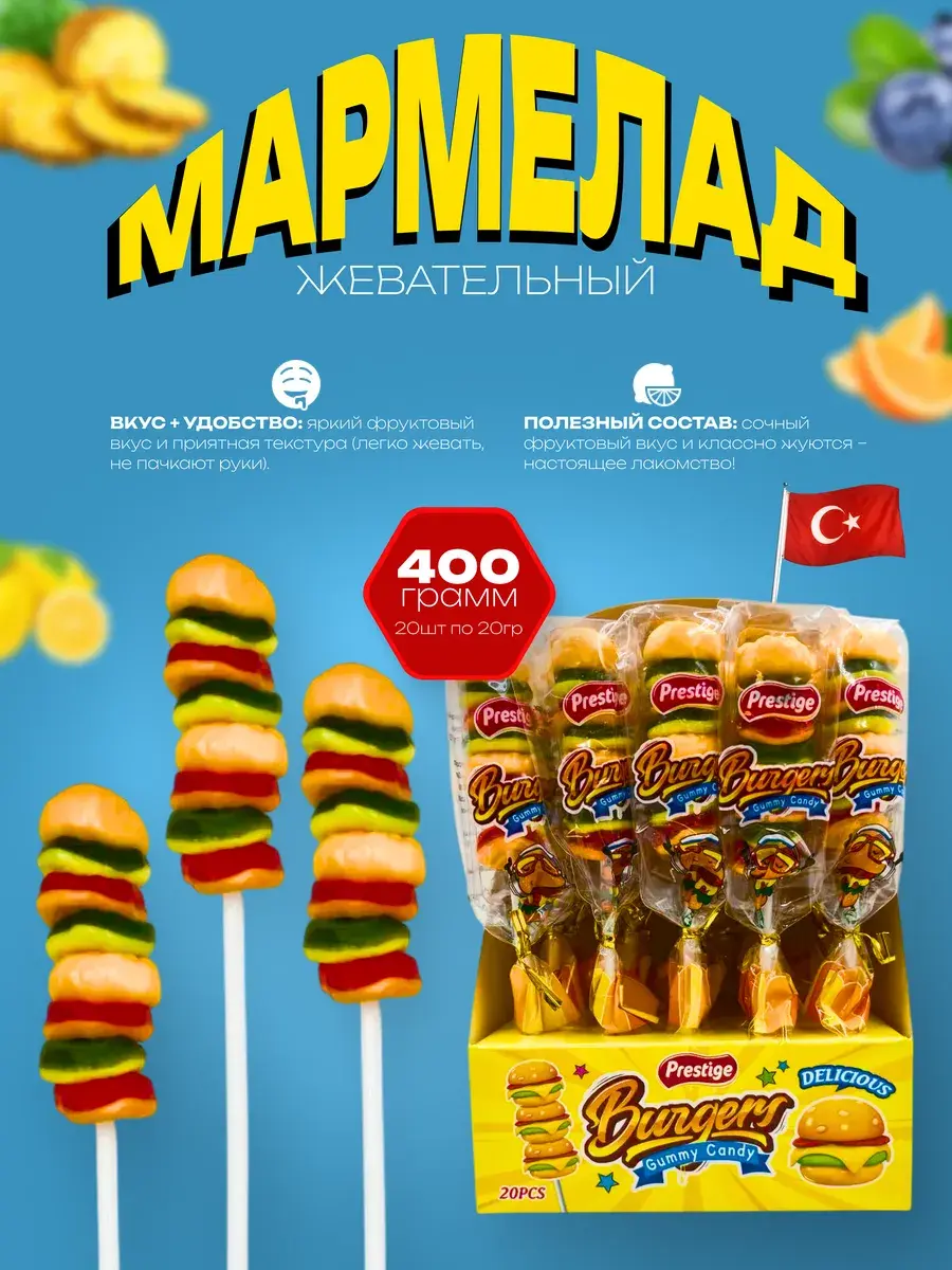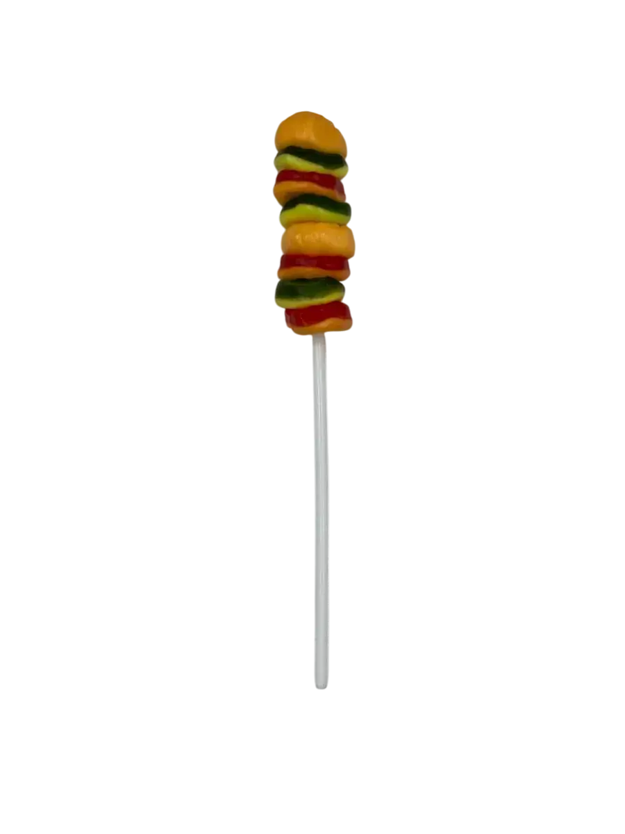 Добро пожаловать в удивительный мир необычных десертов с жевательными бургерами на палочке! Это не просто мармелад – это настоящий праздник в виде невероятно аппетитных бургеров. Забудьте о скучных сладостях, фруктовые бургеры на палочке легко брать с собой - это весело и удобно.