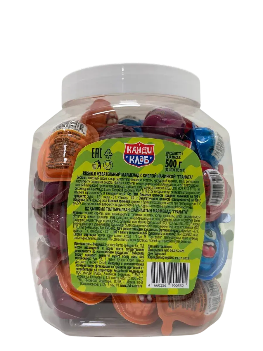 Мармелад с кислой начинкой в форме граната от Канди Клаб — это настоящая находка для любителей сочетания нежной жевательной текстуры и яркой кислинки. Каждая мармеладка весом 10 грамм скрывает внутри насыщенную кислую начинку, которая гармонично дополняет сладкую основу со вкусами арбуза, клубники, колы и манго. Удобная банка, в которой собрано 50 таких мармеладок, делает этот продукт идеальным решением для подарка друзьям, сладкого набора детям на праздник или просто угощения для себя. Такой мармелад станет желанным гостем на Новом годе, дне рождения или Дне знаний, а его практичная упаковка позволяет легко взять лакомство с собой в школу или детский сад. Дети особенно ценят эти мармеладки за их интересную форму граната и неповторимый кисло-сладкий вкус, который нравится не только детям, но и взрослым.