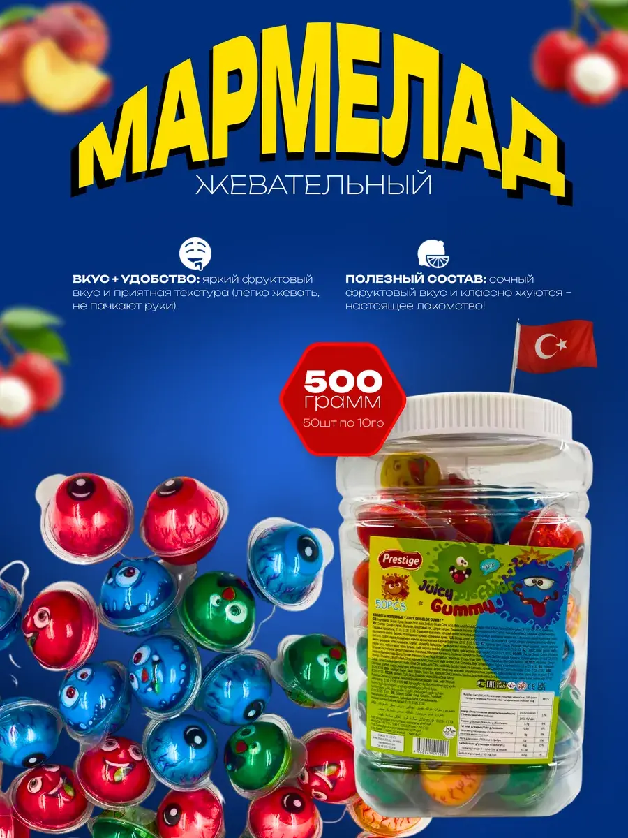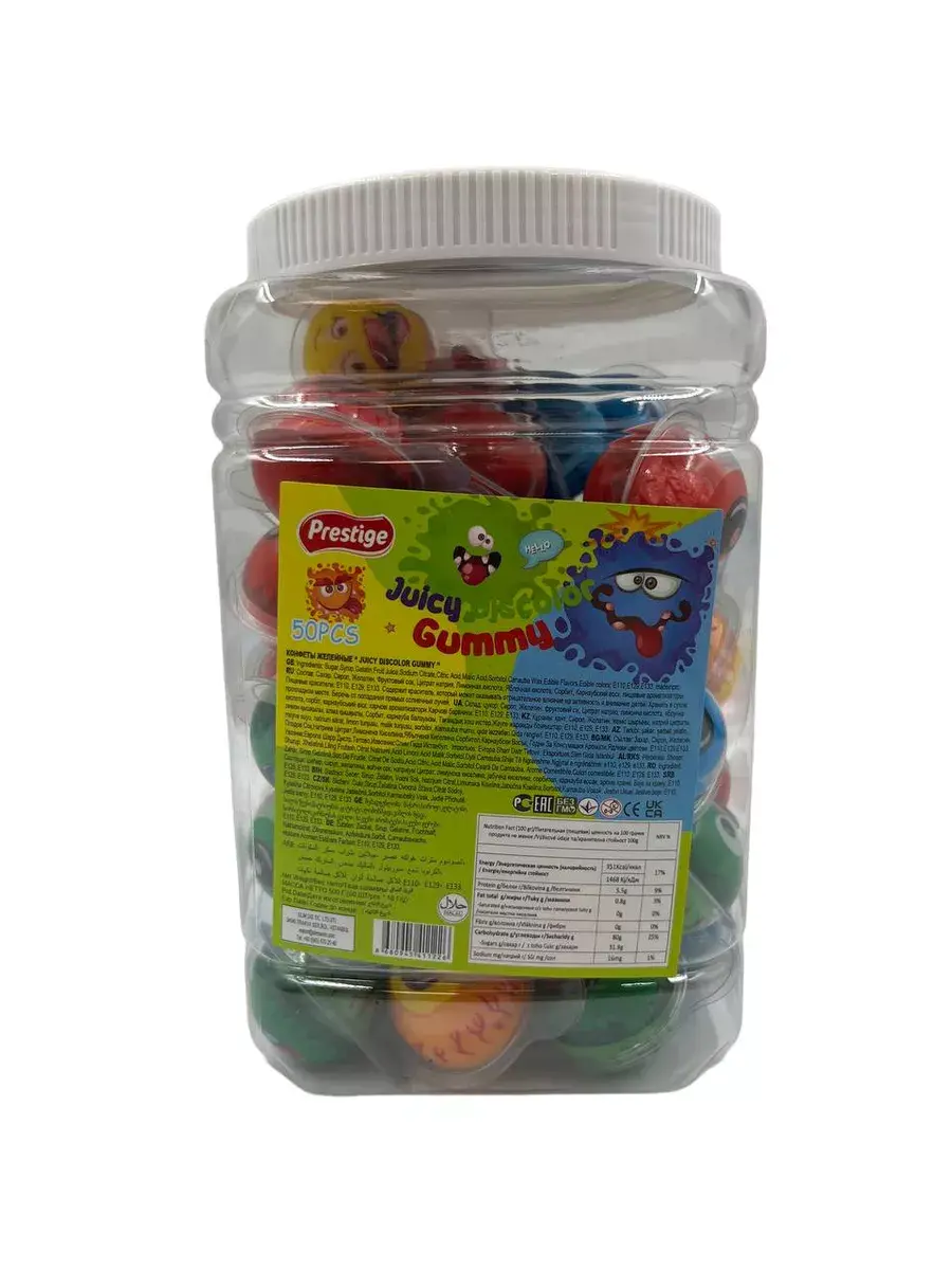 Жевательный мармелад Juicy Discolor - это вкусное лакомство для детей всех возрастов. Он имеет потрясающий вкус и необычную форму в виде глаза и монстров и непременно понравится Вашему ребенку! Жевательный мармелад в упаковке (банка 50 штук). Подарочные наборы продуктов. Мармеладные вкусняшки приносят в качестве угощения в детский сад и школу на 14 и 23 февраля, 8 марта, выпускной и без повода, а также добавляют в новогодние гостинцы. Подарочный бокс с мармеладом будут рады получить малыши, девочки и мальчики 3, 4, 5, 6, 7, 8, 9, 10, 11, 12 лет и даже подростки! Прикольные штуки смогут порадовать близких. Вкусняшки как перекус на прогулку, в путешествие.