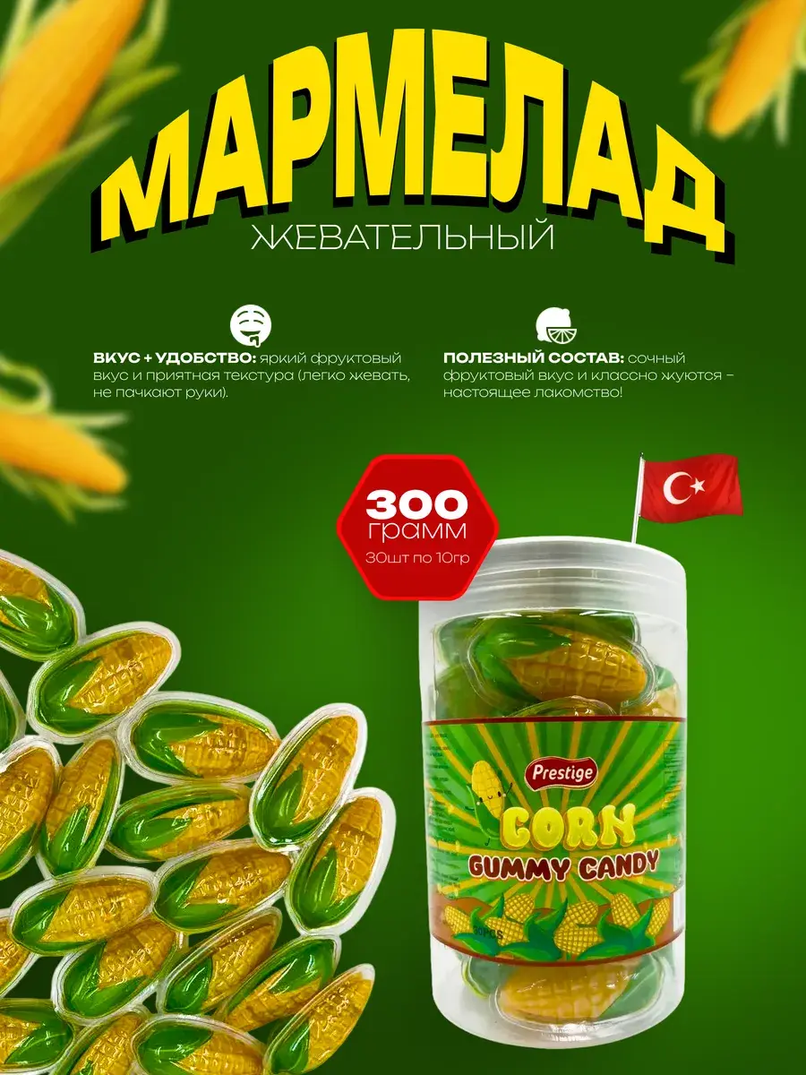 Попробуйте уникальный жевательный мармелад со вкусом сладкой кукурузы от турецкого производителя Prestige. Каждая конфета выполнена в форме аппетитного початка кукурузы и обладает нежным, приятным вкусом, который понравится и детям, и взрослым.