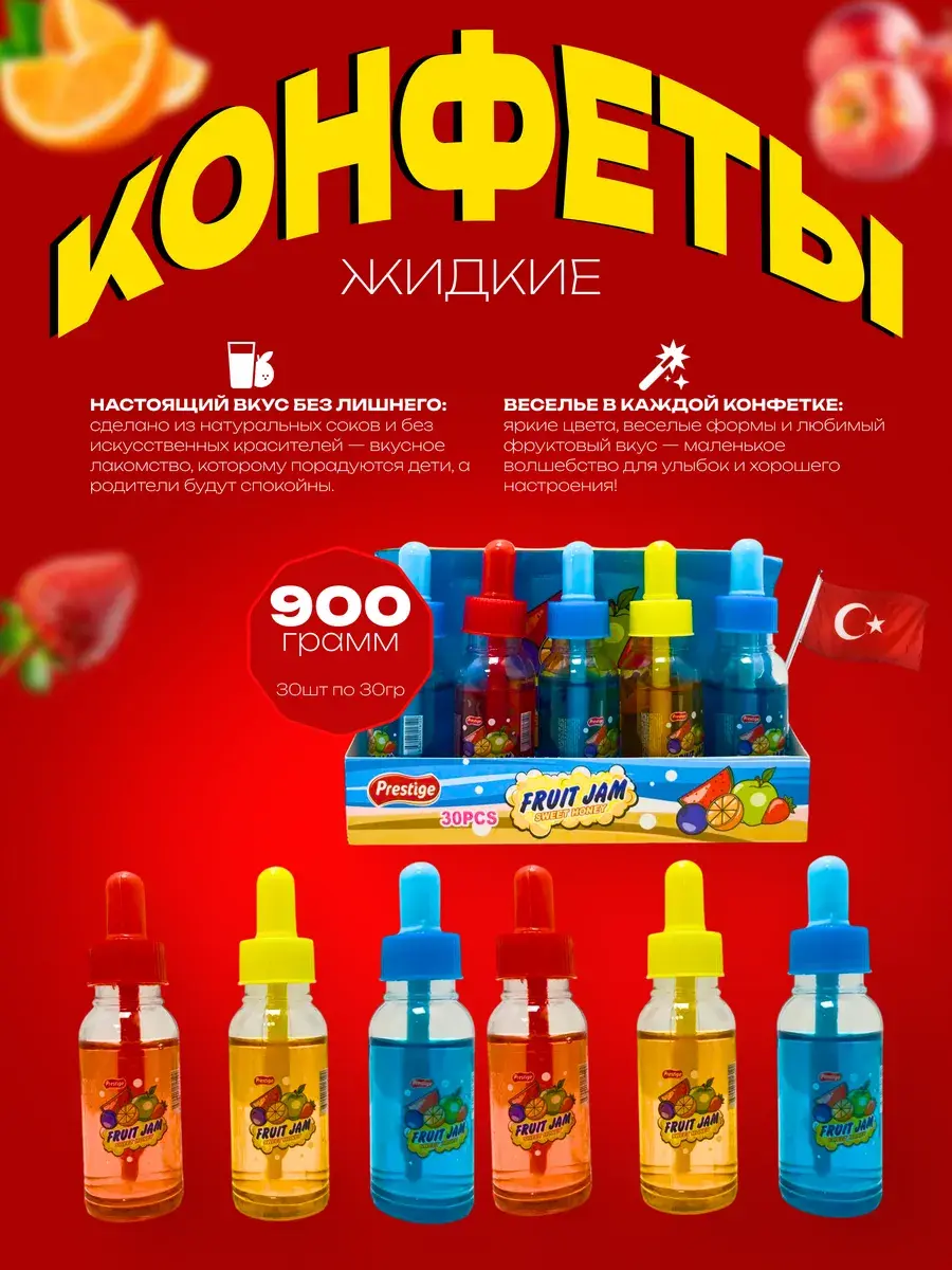 Откройте для себя инновационный способ наслаждаться сладостями с жидкой конфетой в стильной пипетке. Этот научно-игривый формат специально создан для тех, кто ценит креативный подход и точную дозировку удовольствия. Каждая упаковка содержит целых 30 пипеток объемом 30 мл, наполненных насыщенными фруктовыми вкусами premium-качества. Вас ждет настоящая палитра вкусовых экспериментов: нежная сладость спелой клубники, глубокая бархатистость лесной черники, освежающий взрыв цитрусового апельина, сочная свежесть спелого арбуза и хрустящая сладость зеленого яблока. Удобный дозатор позволяет точно контролировать каждую порцию, превращая обычное употребление конфет в увлекательный лабораторный эксперимент. Такой формат станет хитом на подростковых вечеринках, тематических мероприятиях и в розничной торговле, привлекая внимание своей нестандартной подачей. Продукт идеально подходит для пополнения ассортимента магазинов разливных напитков, создания уникальных подарочных наборов и оформления креационных зон в торговых точках. Практичная упаковка гарантирует сохранность всех пипеток при транспортировке, а эргономичная форма делает использование максимально удобным. Обновите свой ассортимент этим трендовым продуктом, который сочетает в себе лучшие фруктовые вкусы, запоминающийся дизайн и невероятную популярность у молодежной аудитории, всегда находящейся в поиске новых гастрономических впечатлений.
