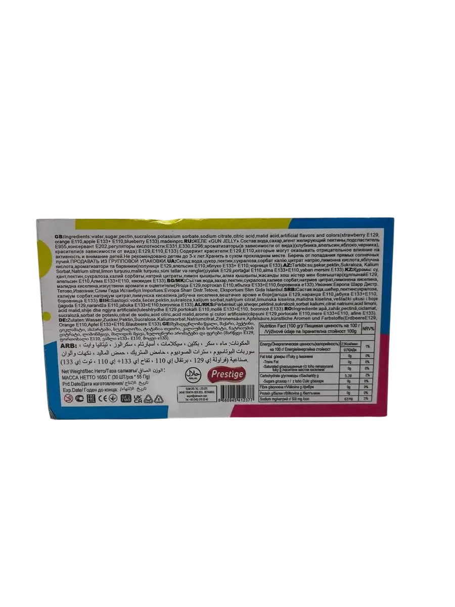 Конфета спрей Спрей Ган Ассорти от турецкого производителя Prestige — это оригинальный и вкусный подарок для детей, который точно порадует юных сладкоежек. Такой формат жидкой конфеты в виде спрея, собранный в удобный набор из тридцати индивидуальных баночек объемом 55 миллилитров каждая, становится настоящим открытием в мире сладостей. Каждый ребенок сможет выбрать свой любимый вкус из представленного ассорти и насладиться сладким удовольствием. Главная особенность, которая делает эти конфеты невероятно привлекательными для детей, — это их форма. Конфета спрей Спрей Ган выполнена в виде водяного пистолета, что превращает процесс употребления сладости в веселую игру. Такой десерт станет отличным дополнением к школьному ланчу, активной прогулке в парке или яркому детскому празднику, добавляя обычному дню немного волшебства и азарта. Родители могут быть спокойны, ведь конфеты не содержат ГМО. Сладкий подарок Спрей Ган от Prestige — это отличный выбор для дня рождения, Нового года, 23 февраля или просто так, без повода, чтобы искренне порадовать ребенка и подарить ему новые незабываемые впечатления, сочетающие в себе вкус и активное развлечение.