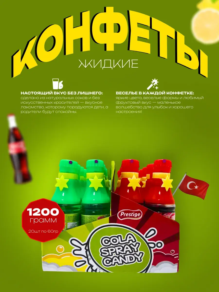 Два легендарных вкуса в одном наборе! Освежающий Lemon Spray с кисло-сладким вкусом ледяного лимонада и классический Cola Spray с узнаваемым газированным букетом. Ваша карманная порция радости теперь в удобных бутылочках по 60 мл. В упаковке вас ждет идеальный баланс: 10 бутылочек лимонада и 10 бутылочек колы. Это готовый набор для вечеринки, подарка или выгодного пополнения ассортимента. Просто нажмите и распылите вкус — никакой липкости, только взрыв эмоций и сочное послевкусие. Новый формат любимых вкусов, который делает обычный перекус настоящим приключением